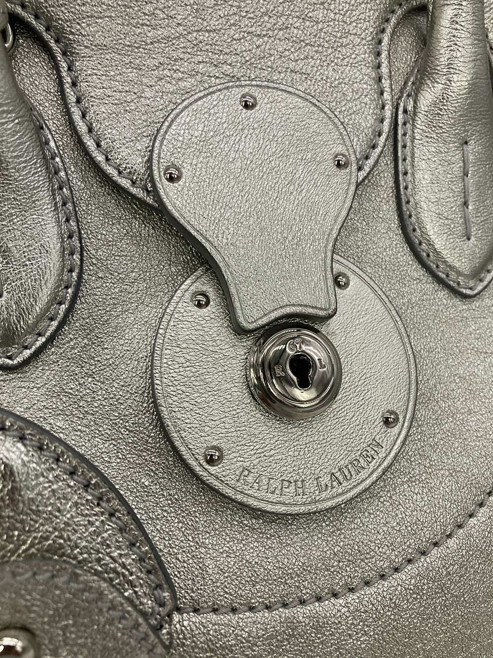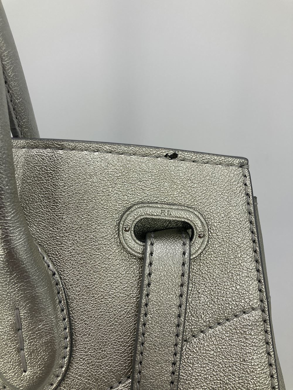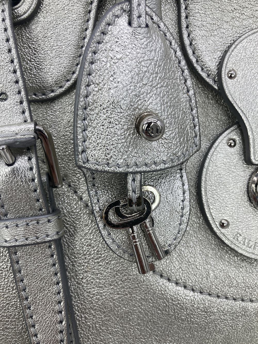 Ralph Lauren Silver Leather Rickey Bag in good condition. Silver leather exterior trimmed with silver hardware. Front sliding latch and double buckle closure opens to a black leather interior with one slit side pocket. overall good condition. a few small scuffs and chips in silver color around exterior- see photos. measurements: 13"x11.75"x7" 4" handle 19-23" strap drop #Bags3012