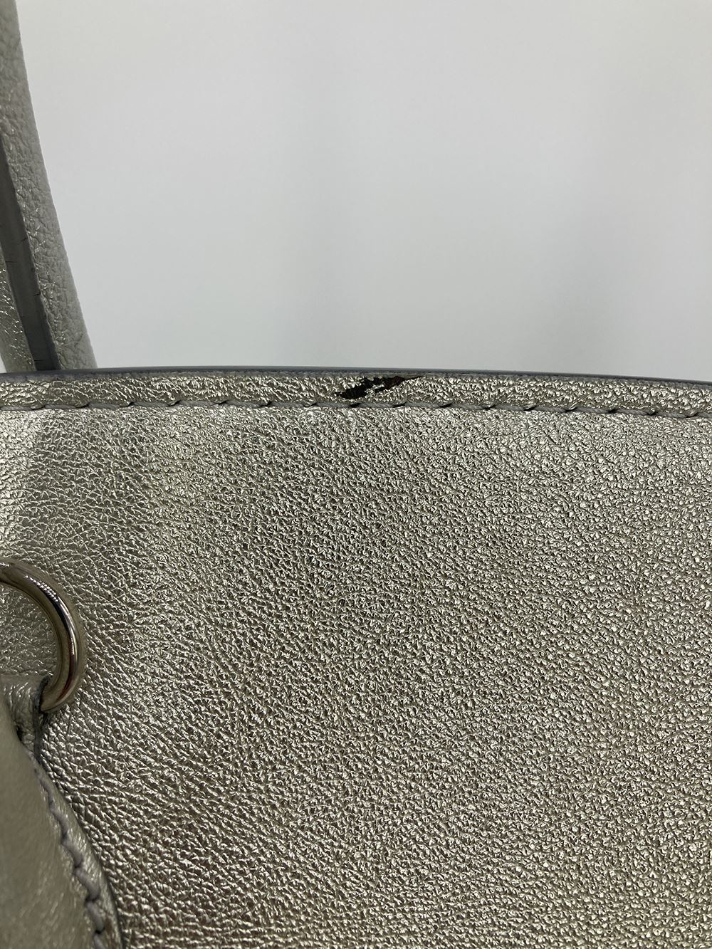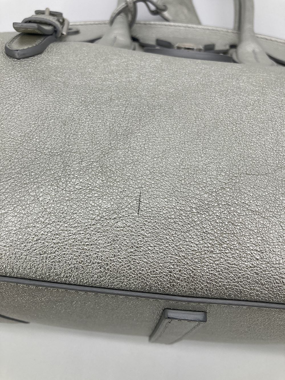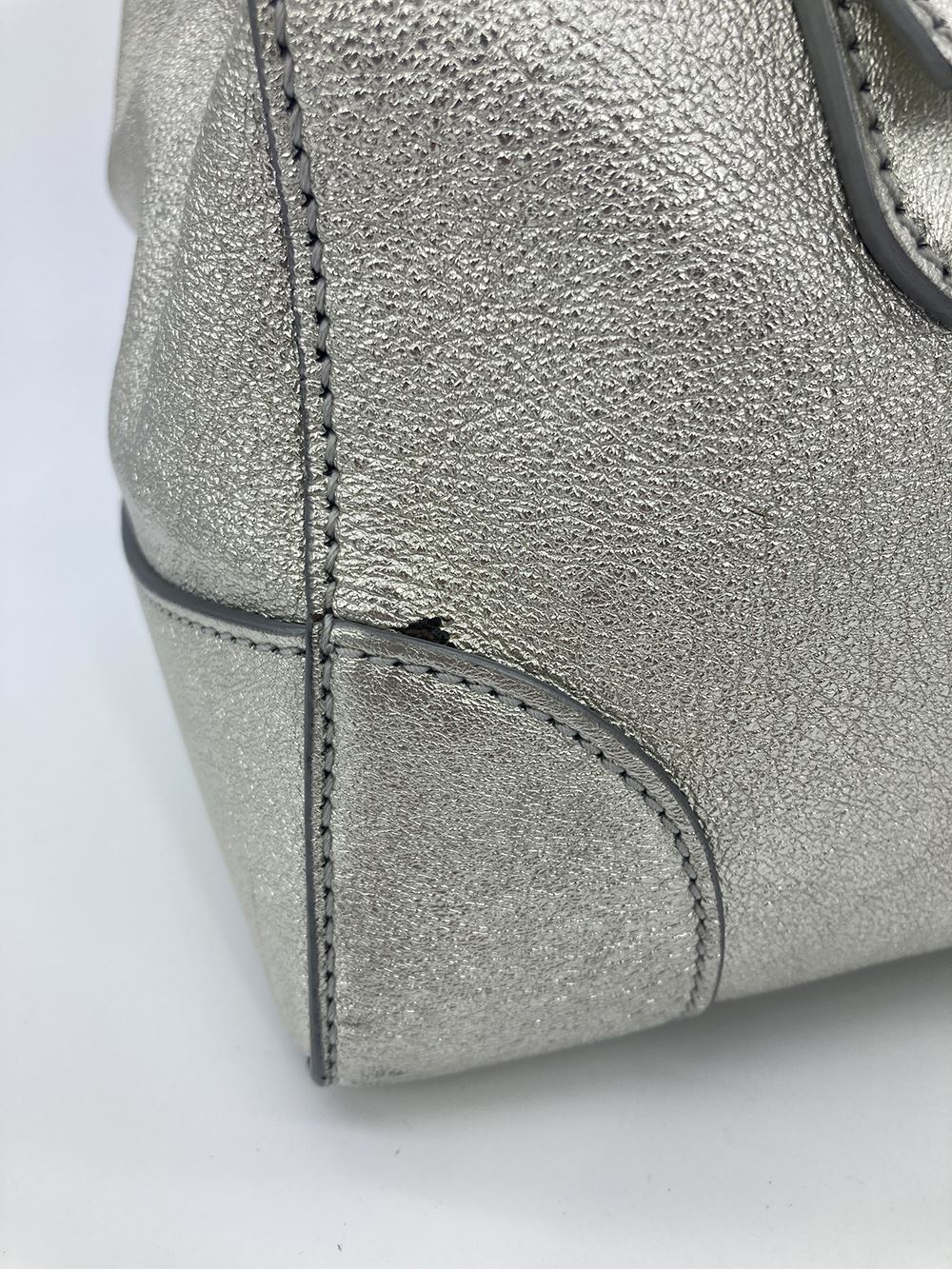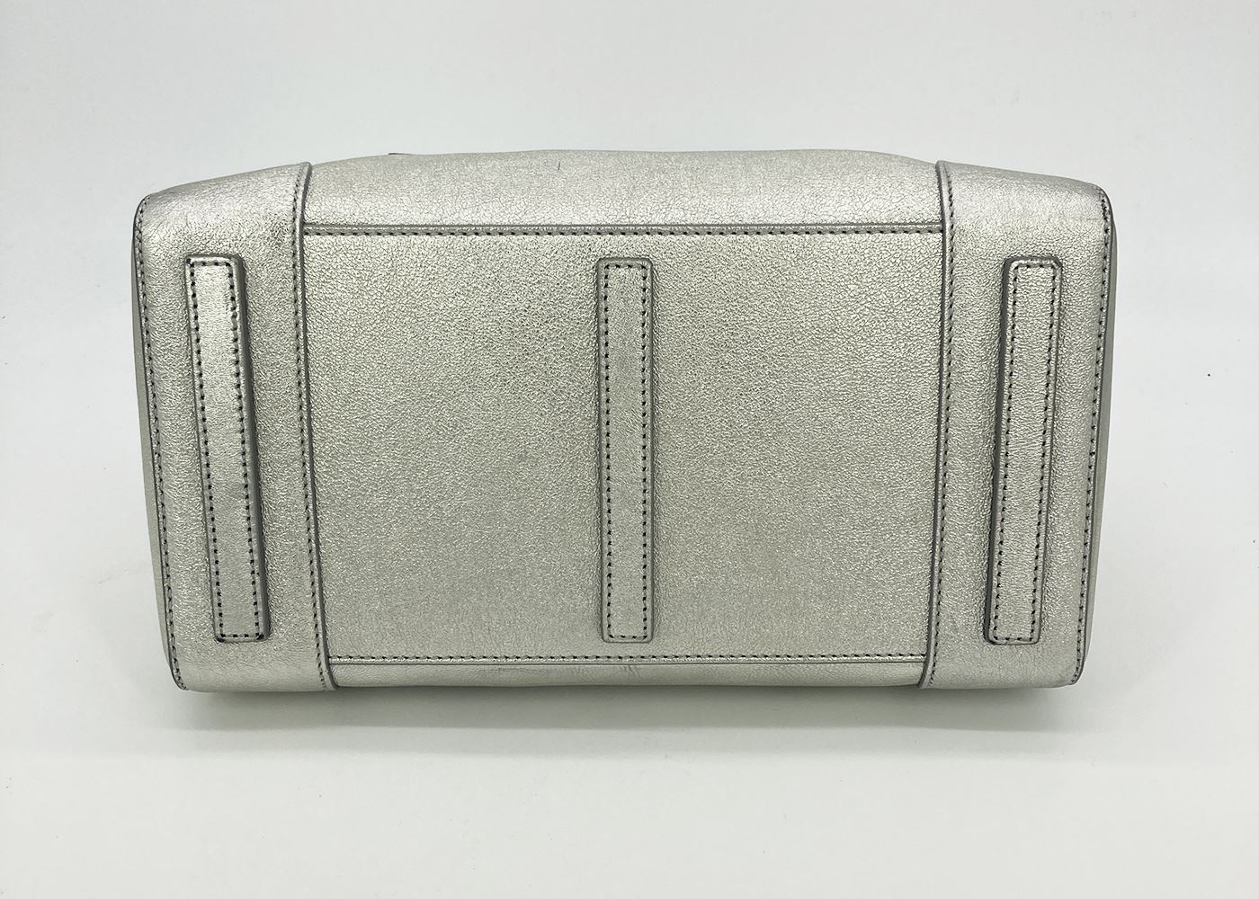 Ralph Lauren Silver Leather Rickey Bag in good condition. Silver leather exterior trimmed with silver hardware. Front sliding latch and double buckle closure opens to a black leather interior with one slit side pocket. overall good condition. a few small scuffs and chips in silver color around exterior- see photos. measurements: 13"x11.75"x7" 4" handle 19-23" strap drop #Bags3012