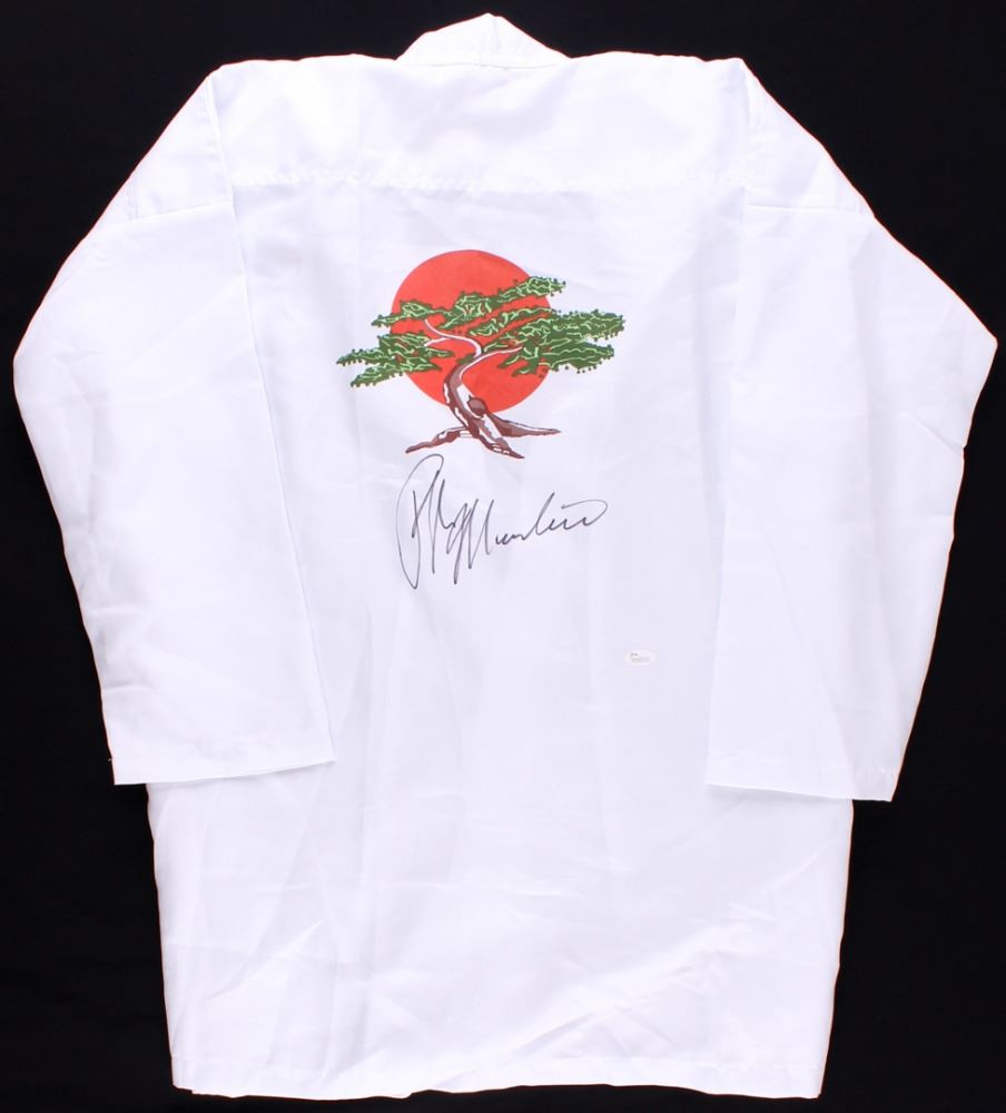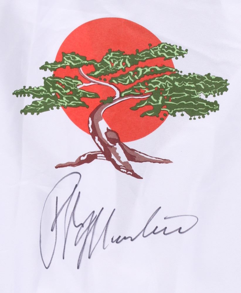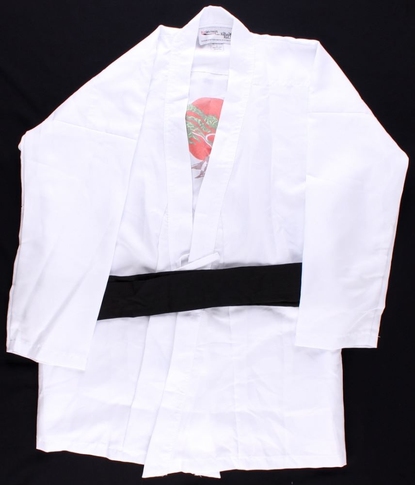 "Karate Kid" movie prop replica uniform shirt, size L. The uniform has been hand-signed in black felt-tip pen by Ralph Macchio. In 1984, Macchio became known internationally following the release of the first Karate Kid film. Playing high school senior Daniel LaRusso, Macchio was actually in his early twenties when the film was made. He continued this success with the film's sequels, The Karate Kid Part II and The Karate Kid Part III. The lot / autograph(s) includes an official James Spence Authentication (JSA) hologram and matching COA for authenticity purposes. The signing of this item was witnessed by JSA.