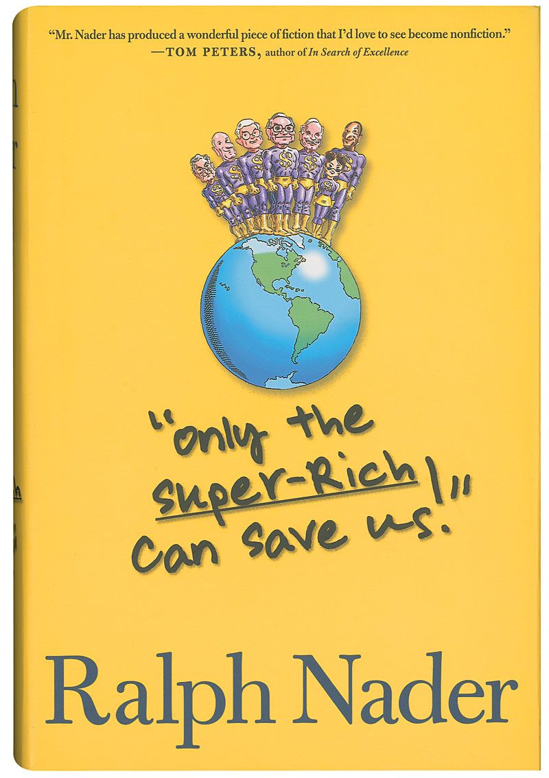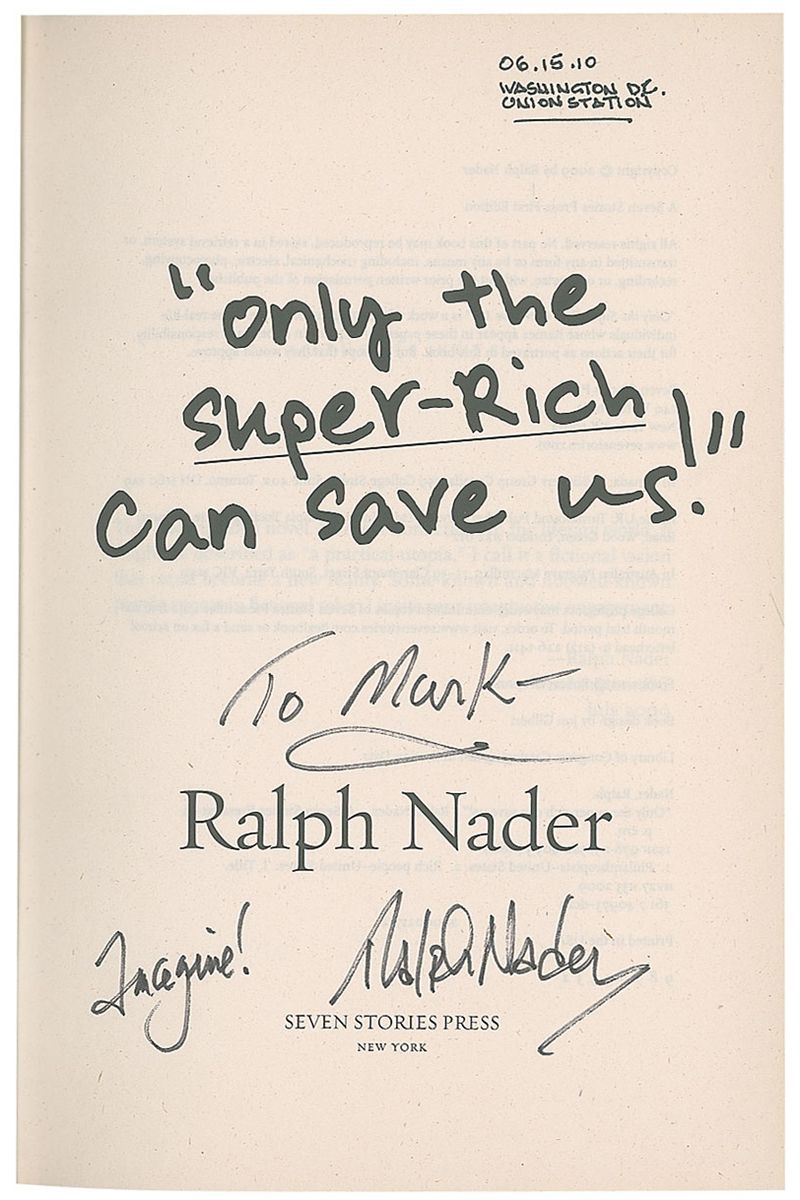 Signed book: Only the Super-Rich Can Save Us! First edition, later printing. NY: Seven Stories Press, 2009. Hardcover with dust jacket, 6.25 x 9.25, 733 pages. Signed and inscribed on the title page in black felt tip, “To Mark—Imagine! Ralph Nader.” Collector’s notation to title page indicates it was signed in Washington on June 15, 2010. In very fine condition.