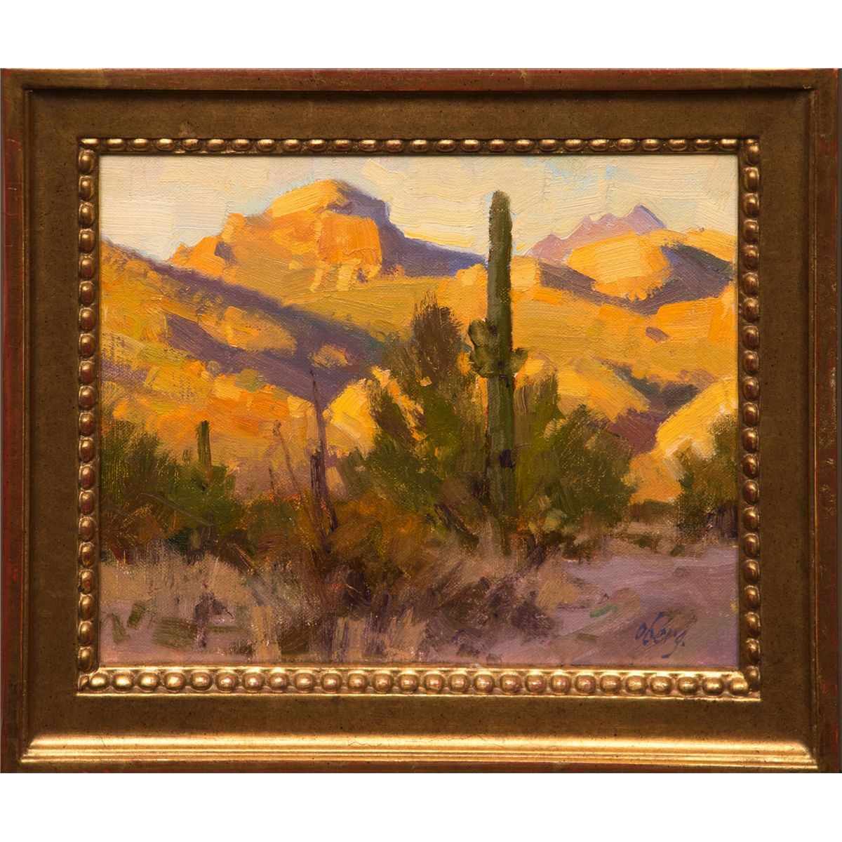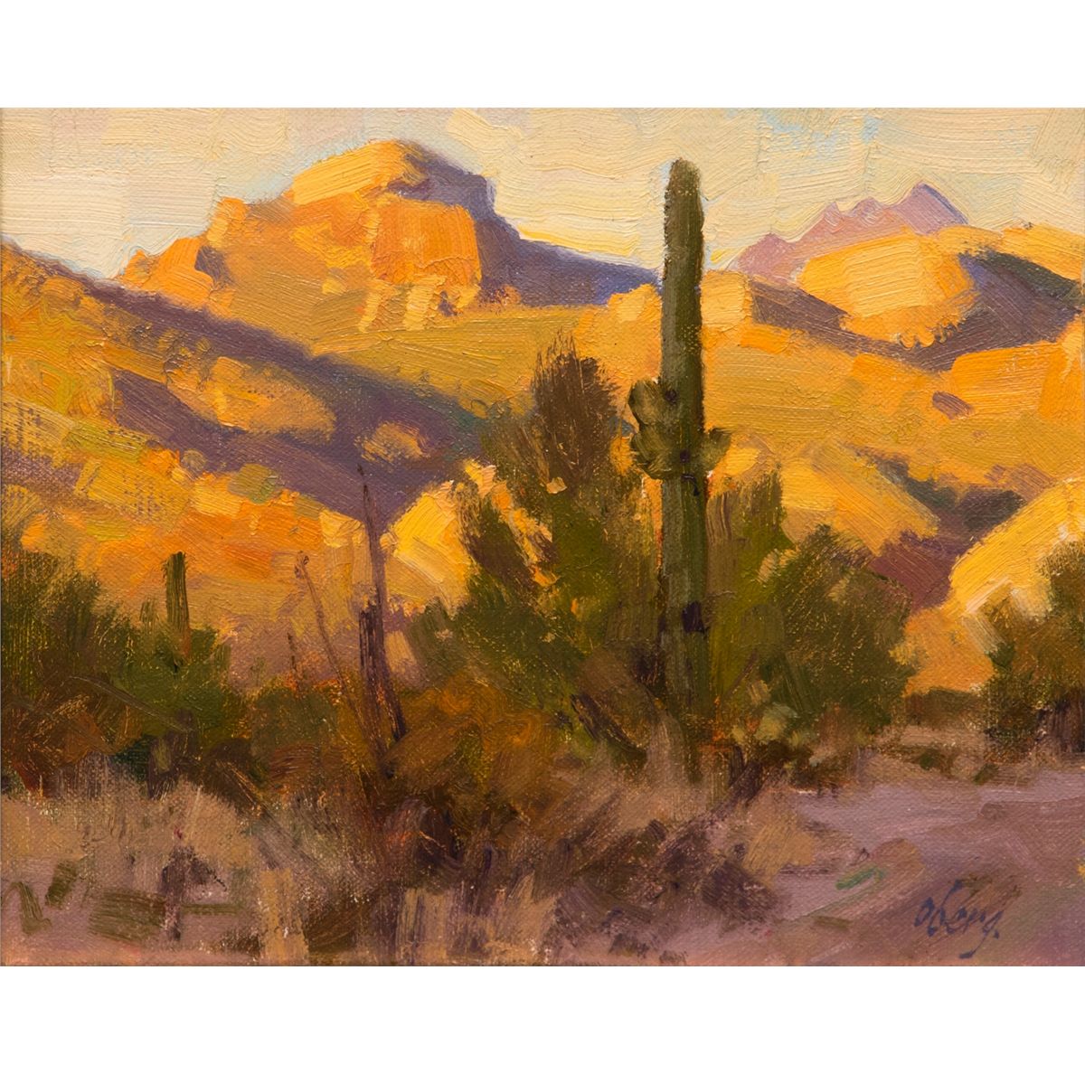 Ralph Edward Oberg (1950 - ). Sonoran Sunset. 8" x 10" oil on board. Signed lower right: oberg. Verso: titled, dated 99 and signed along with notation PAINTED ON LOCATION: TONTO NAT. FOR. ARIZONA 1/99.