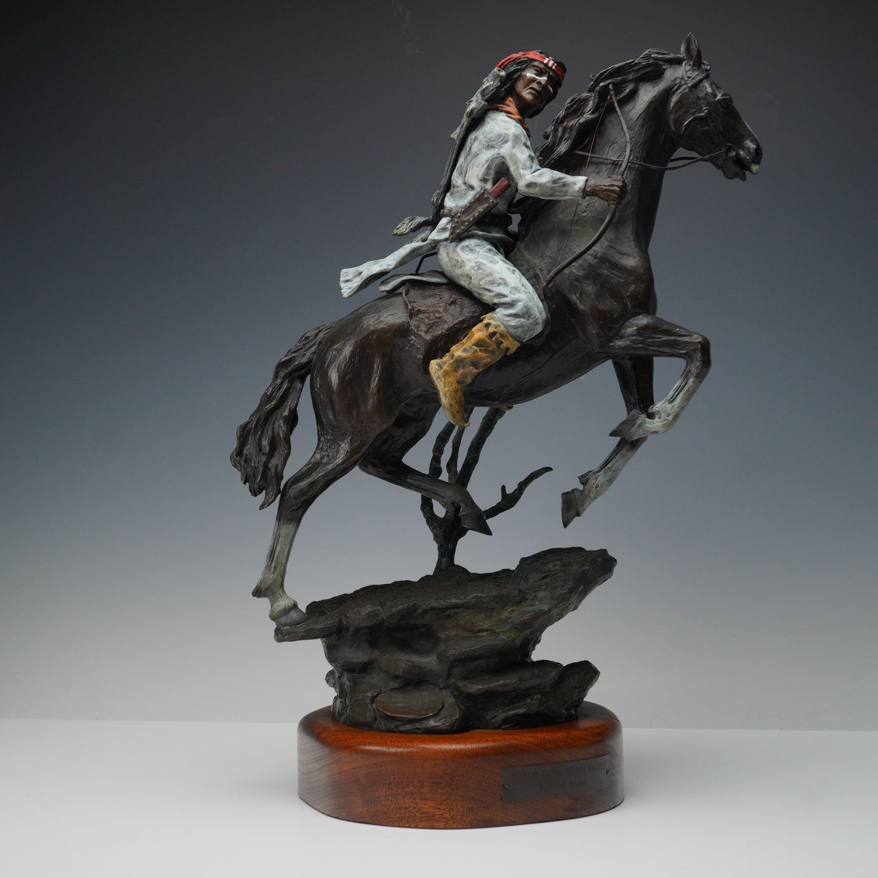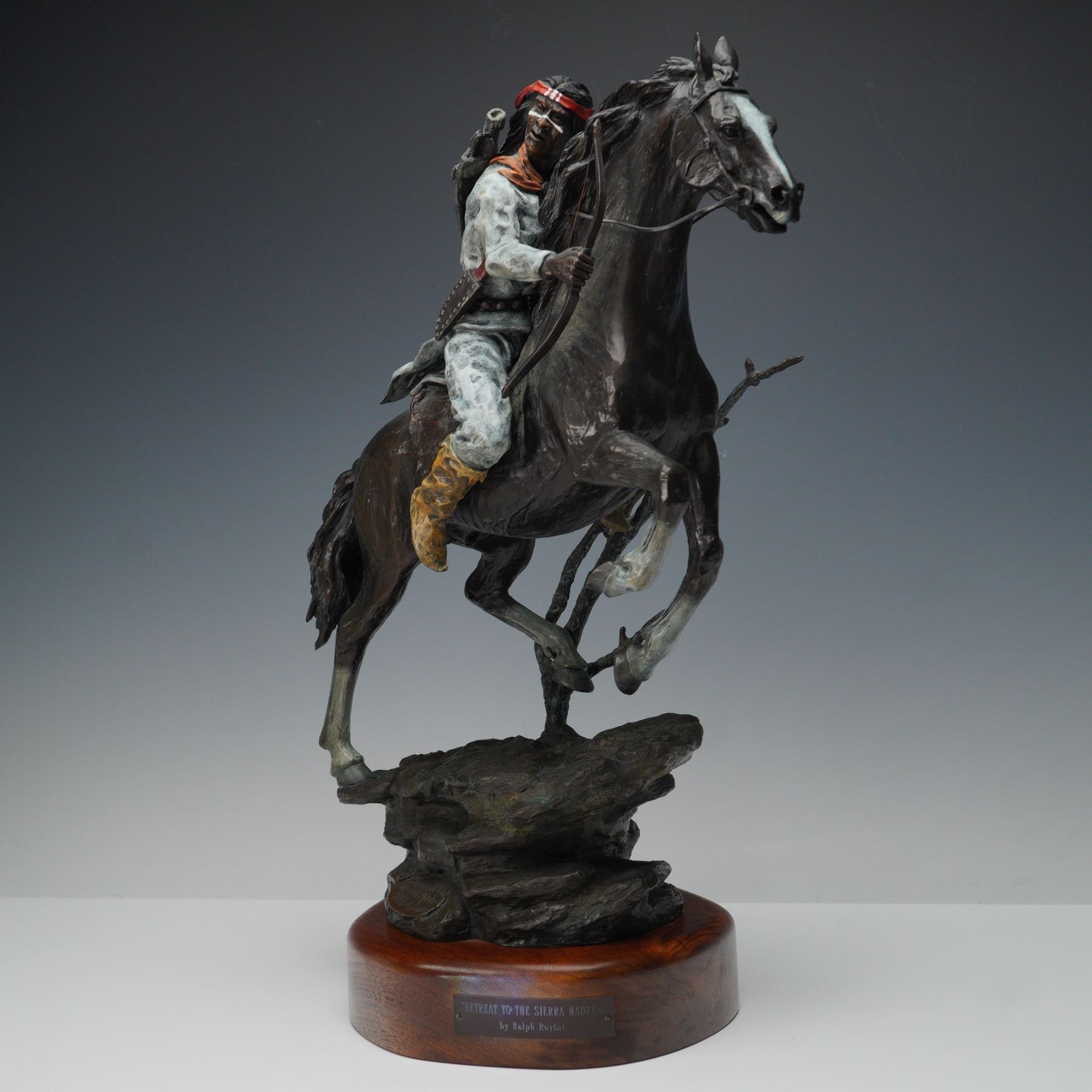 A dynamic limited edition bronze sculpture by Ralph Roybal titled Retreat to The Sierra Madres. This striking work captures a Native American warrior astride a rearing horse, bow in hand, poised in motion with meticulous detail in both rider and mount. The sculpture rests on a finely finished wooden base with an engraved title plaque and bears the artist's signature and edition number inscribed on the bronze. Roybal, known for his evocative depictions of Native American themes, brings vitality and intensity to this rare composition, blending realism with expressive artistry. Signed, dated and numbered 28/30.