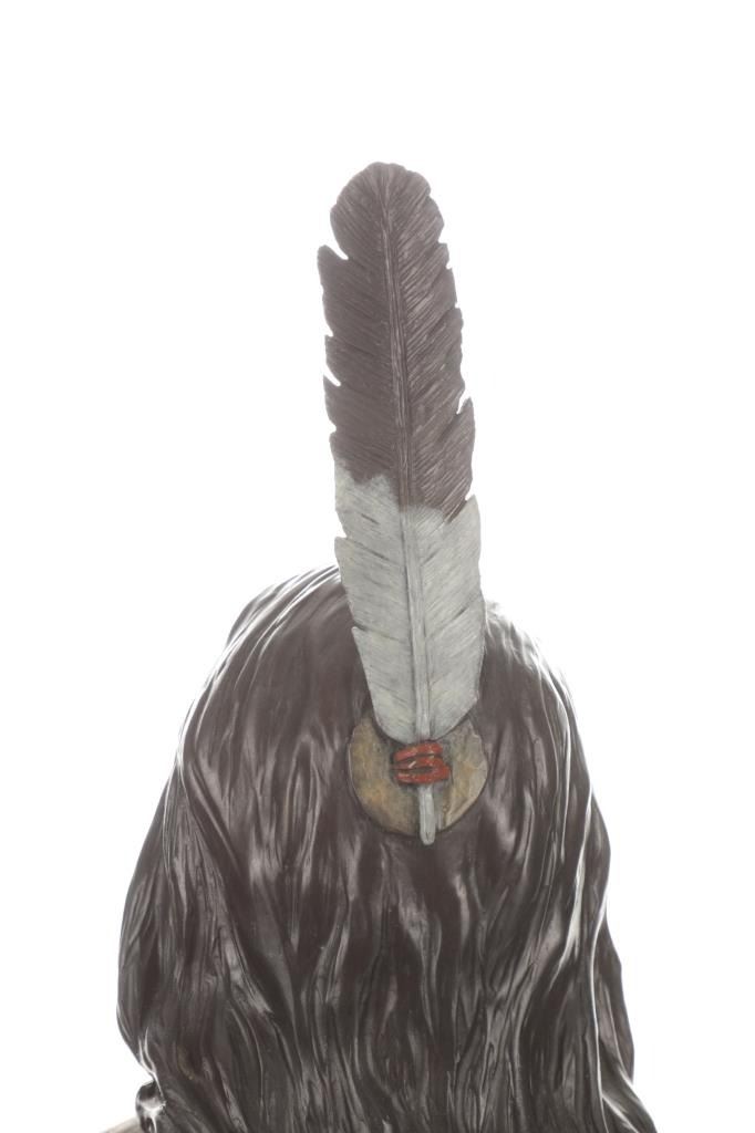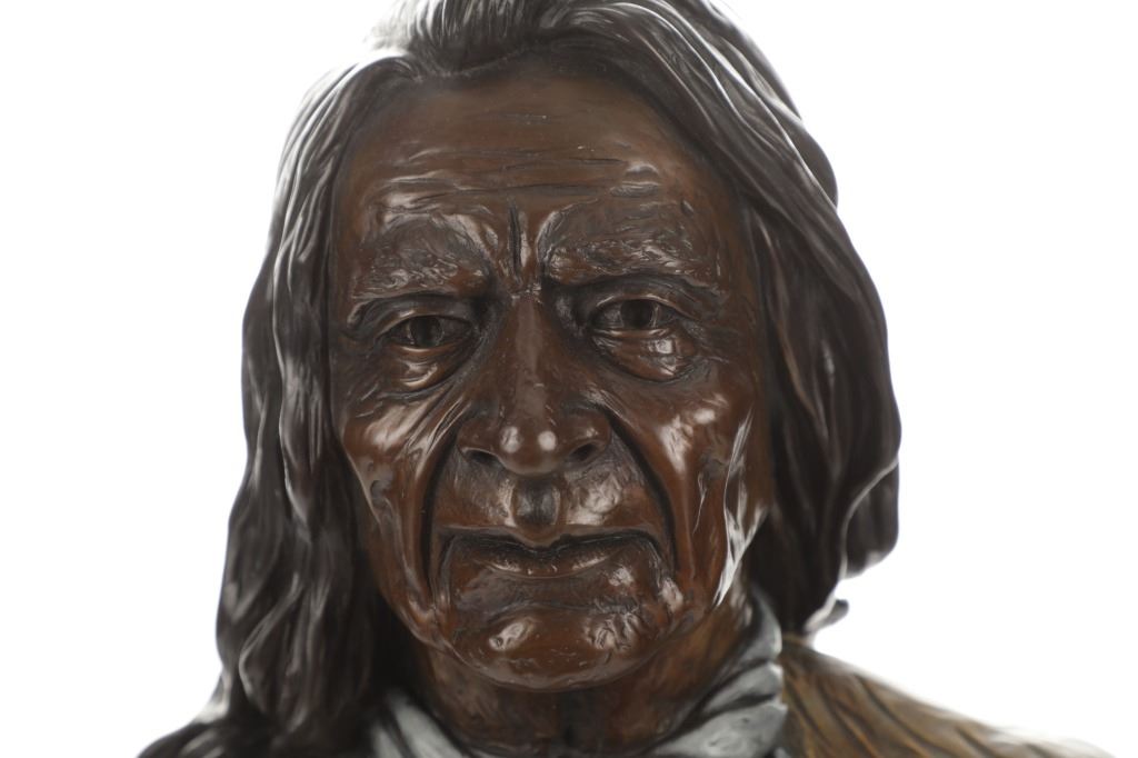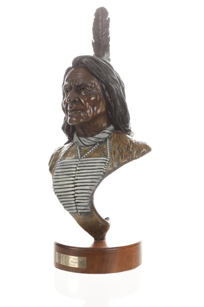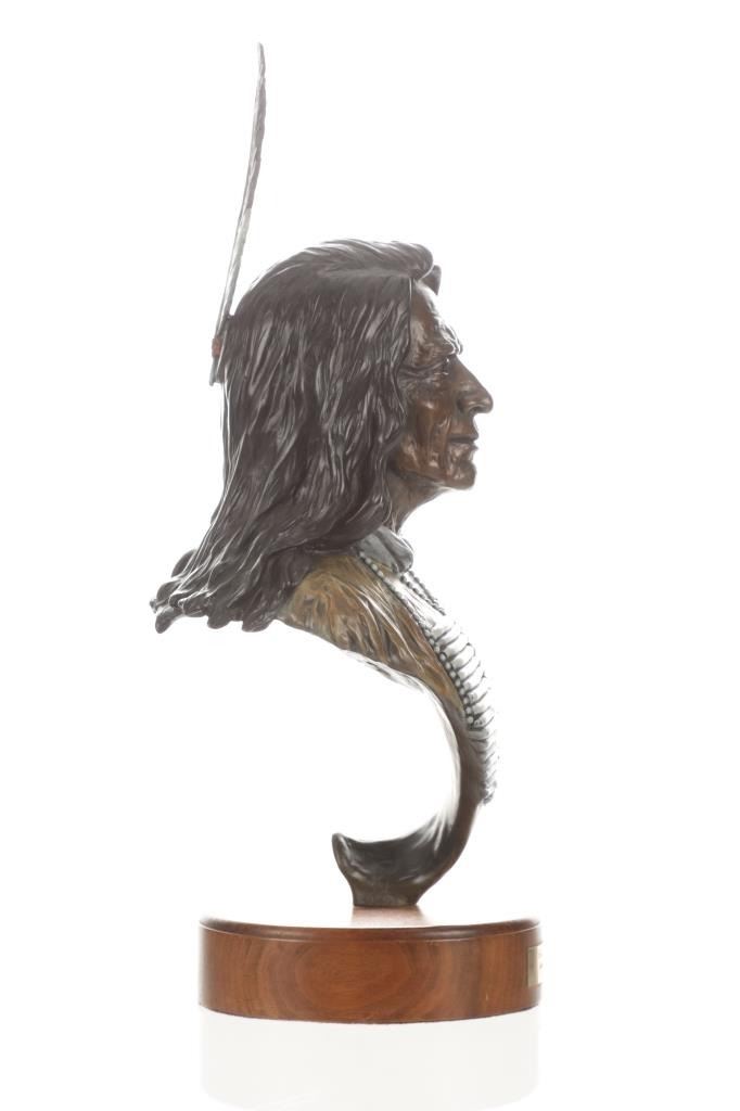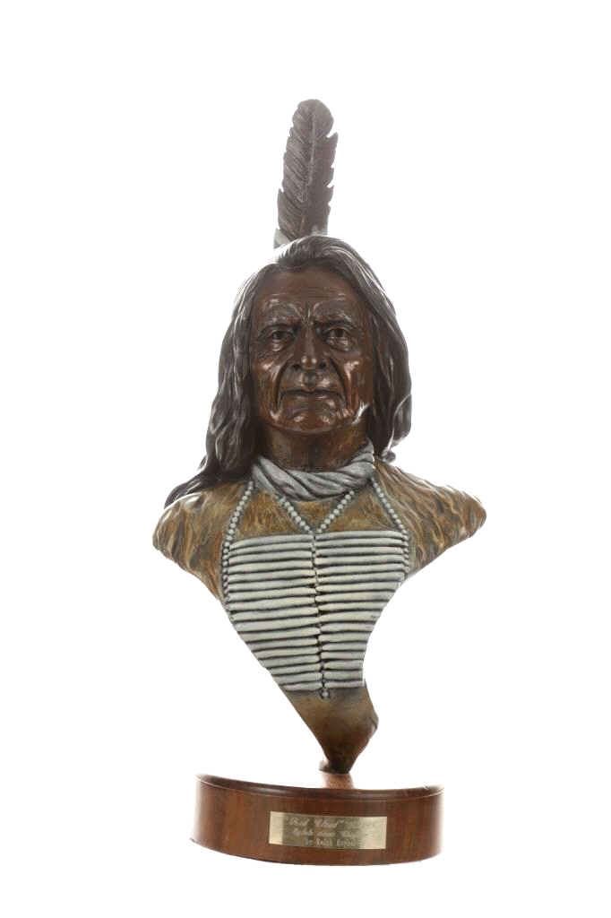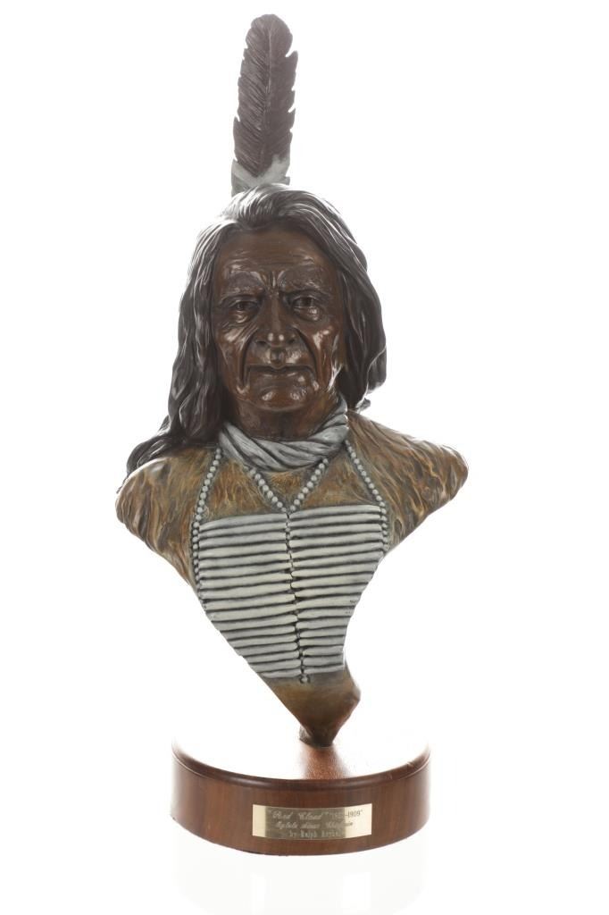 Featured in this lot is this bronze sculpture called "Red Cloud," circa 1985 and by Albuquerque artist Ralph Roybal born in 1955. The bronze features a wonderfully and professionally crafted bronze construction that features a bust sculpture of Oglala Sioux chieftain Red Cloud and shows a beautiful patina to the bronze that shows colors of white for the collar and to the feather in his hair and is mounted no a hardwood shield. The bronze itself is marked and numbered 1/30 and the date of 1986. The plaque reads as follows: "Red Cloud" 1822-1909 - Oglala Sioux Chieftain - by Ralph Ryoubal. Ralph Roybal is an Albuquerque artist who devotes his talents to creating bronze sculptures of the American West. He worked in the Santa Fe Foundry and the Dell Weston Studio Foundry. Work at foundries gradually led to full-time sculpture work in 1985. The condition of this bronze is good with a slight looseness to the connection but otherwise shows good overall condition. The measurements of this bronze 19" x 8 1/2" x 7".