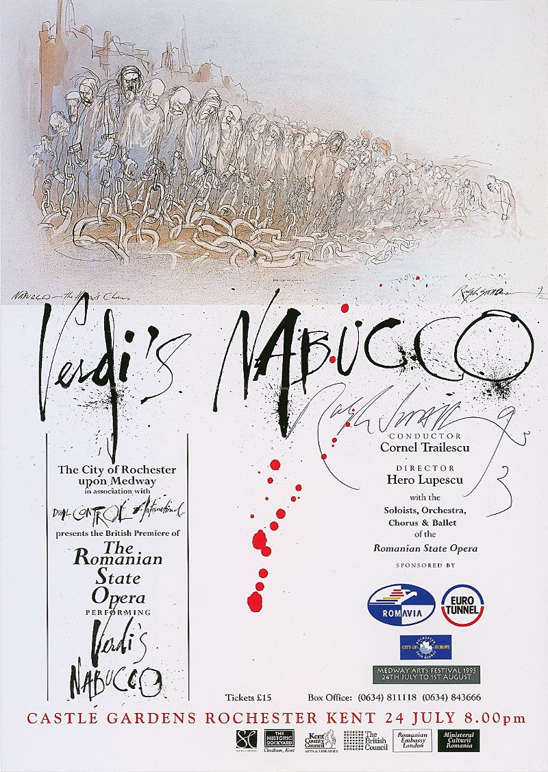 Color 11.5 x 16.25 poster for a performance of Verdi’s Nabucco, signed in black ballpoint, “Ralph Steadman 93.” In fine condition, with a central horizontal fold.
