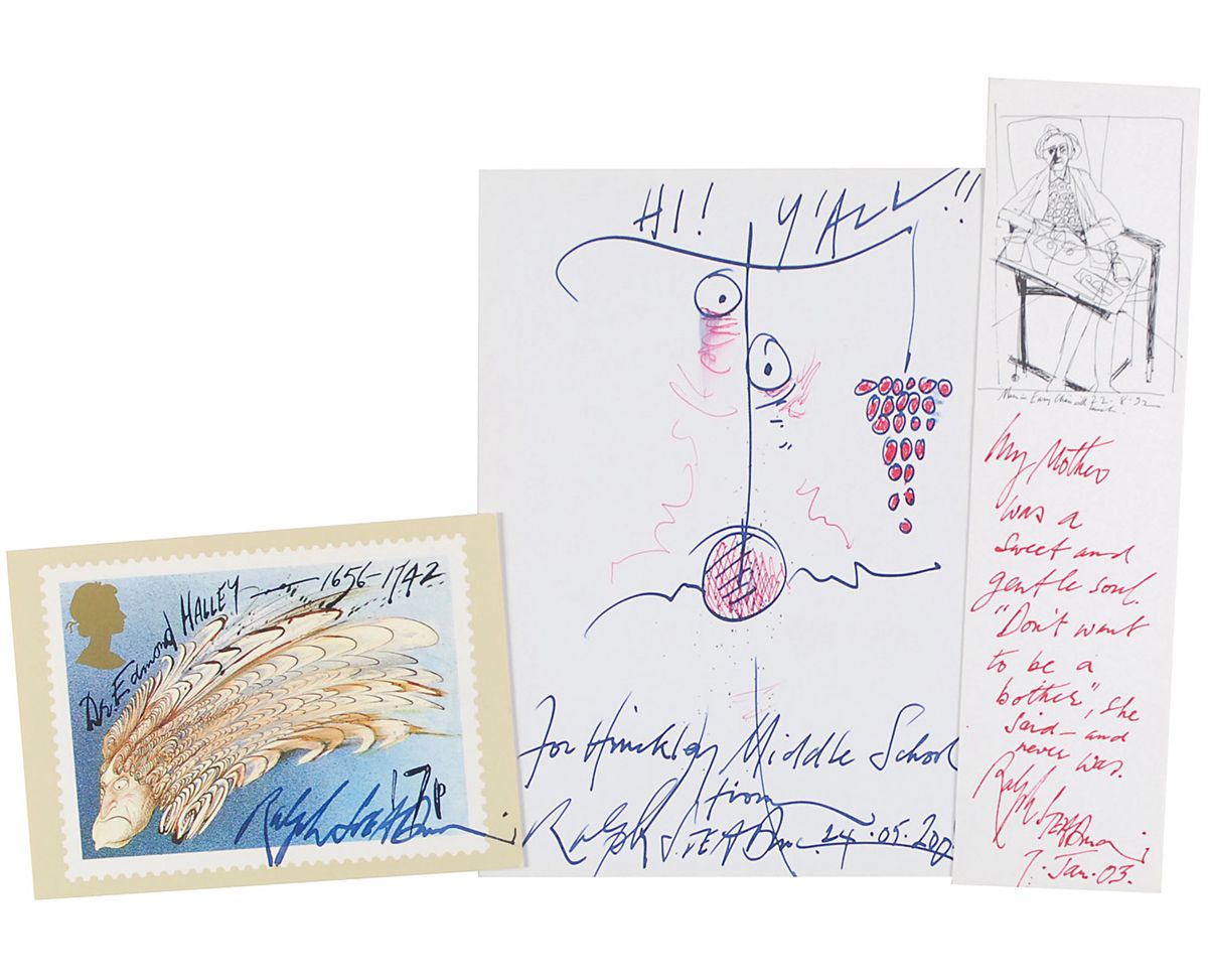 British cartoonist (born 1936) best known for his work with American author Hunter S. Thompson. Three items: an abstract ink sketch on the reverse of a 5.75 x 8.25 card advertising Plague and the Moonflower, signed and inscribed at the bottom; a 2.5 x 9.25 bookmark featuring a portrait of his mother, captioned in red felt tip, “My mother was a sweet and gentle soul. ‘Don’t want to be a bother,’ she said—and never was. Ralph Steadman, 7 Jan 03”; and a color 5.75 x 4 postcard of Steadman’s ‘Halley’s Comet’ caricature, signed in blue felt tip. In overall fine condition.
