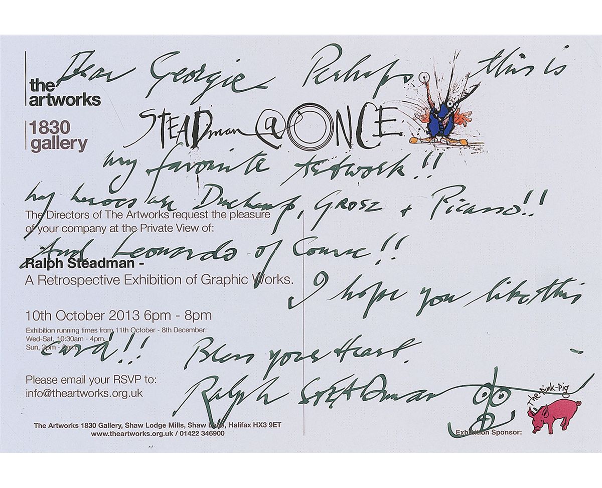 An exhibition postcard for Steadman’s retrospective at The Artworks 1830 Gallery in 2013, 8.25 x 5.75, signed on the front in black ink, “Ralph Steadman,” with an ANS on the reverse, in full: “Perhaps this is my favorite artwork!!! My heroes are Duchamp, Grosz & Picasso!! And Leonardo of course!! I hope you like this card!!!” Steadman also adds a quick sketch beside his signature. In fine condition.
