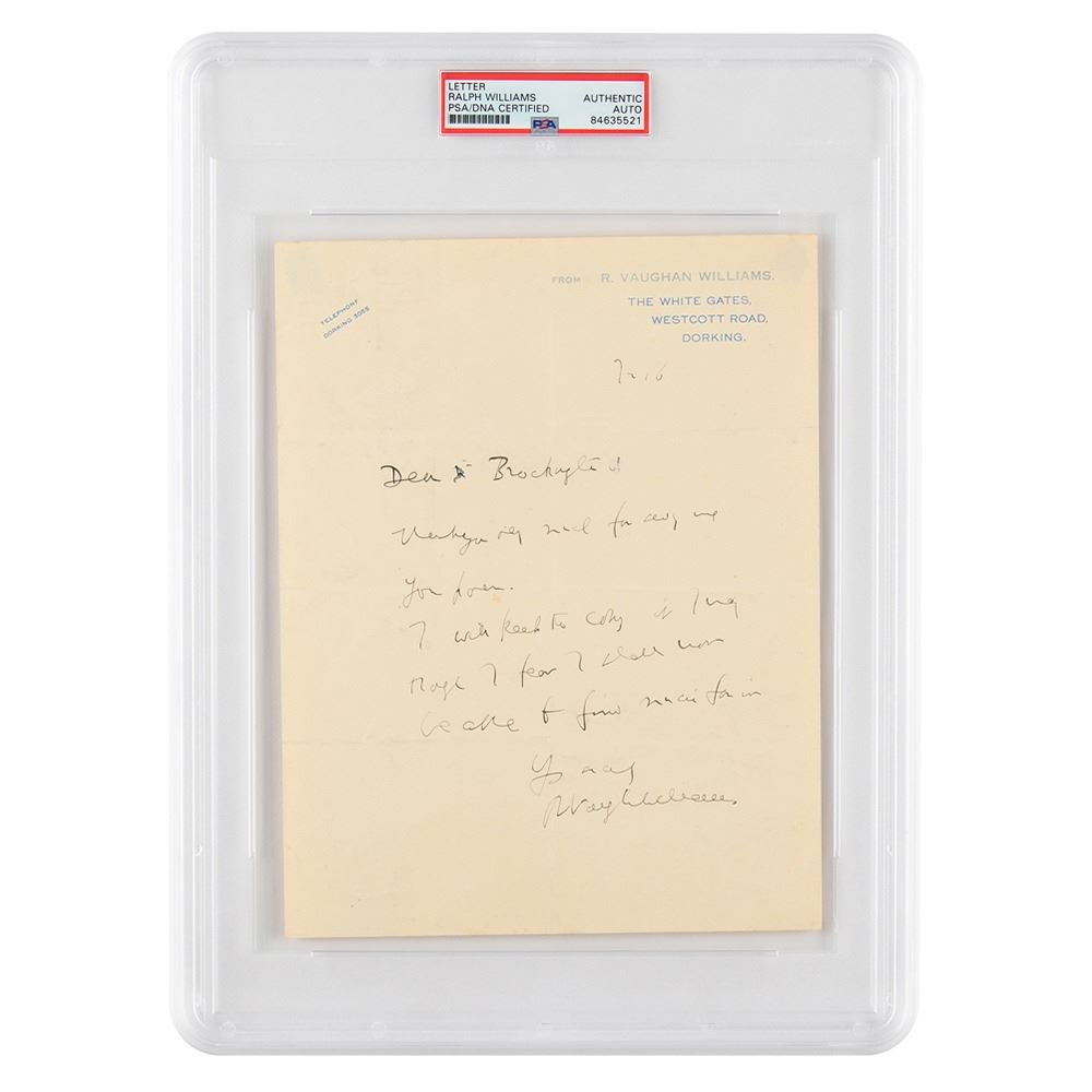 ALS signed “R. Vaughan Williams,†one page, 7 x 9, personal letterhead, no date. A handwritten letter, in part: "Thank you very much for sending me your poem. I will keep the copy…though I fear I shall not be able to find music for it." In fine condition, with light show-through at the top corners from old mounting remnants on the back. Encapsulated in a PSA/DNA authentication holder.