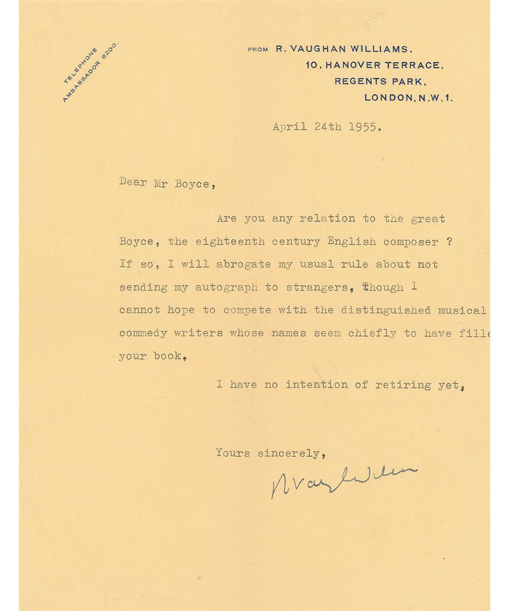 Influential English composer (1872–1958) of symphonies, chamber music, opera, choral music, and film scores. He was also an important collector of English folk music and song. TLS signed “R. Vaughan Williams,” one page, 7 x 9, personal letterhead, April 24, 1955. Letter to Thomas Boyce of Belgium. In full: “Are you any relation to the great Boyce, the eighteenth century English composer? If so, I will abrogate my usual rule about not sending my autograph to strangers, though I cannot hope to compete with the distinguished musical comedy writers whose names seem chiefly to have filled your book. I have no intention of retiring yet.” In fine condition, with central vertical and horizontal folds, and a few paperclip impressions to the left border. Accompanied by the original mailing envelope.