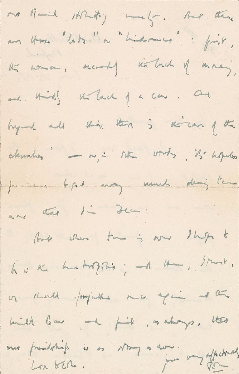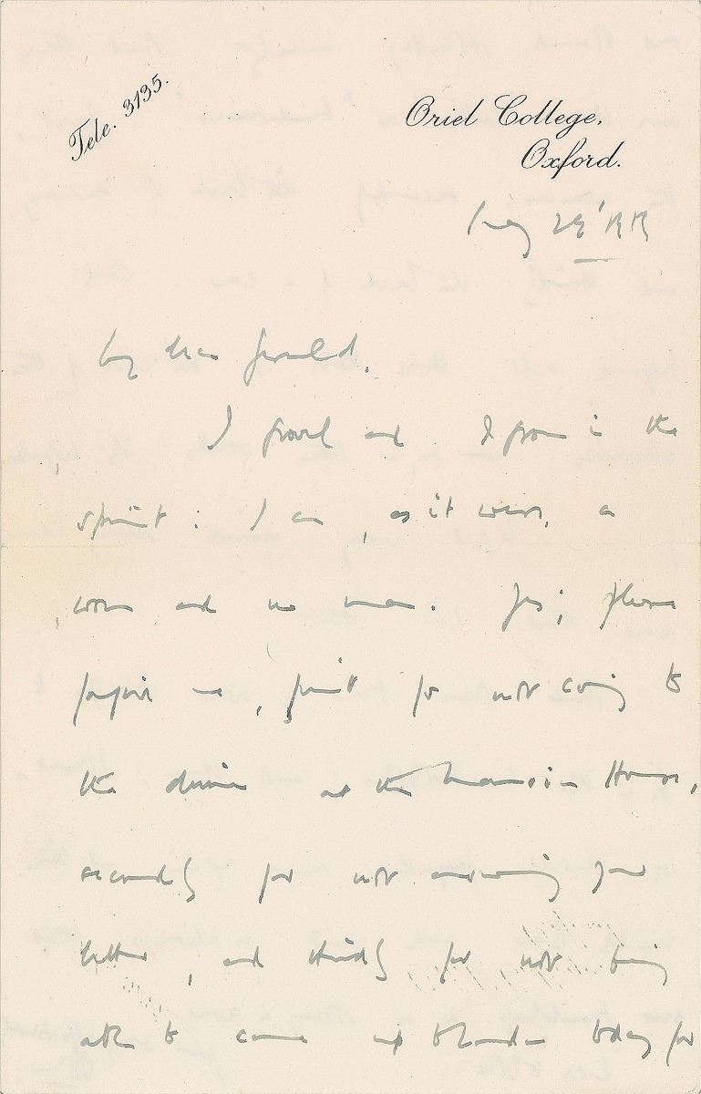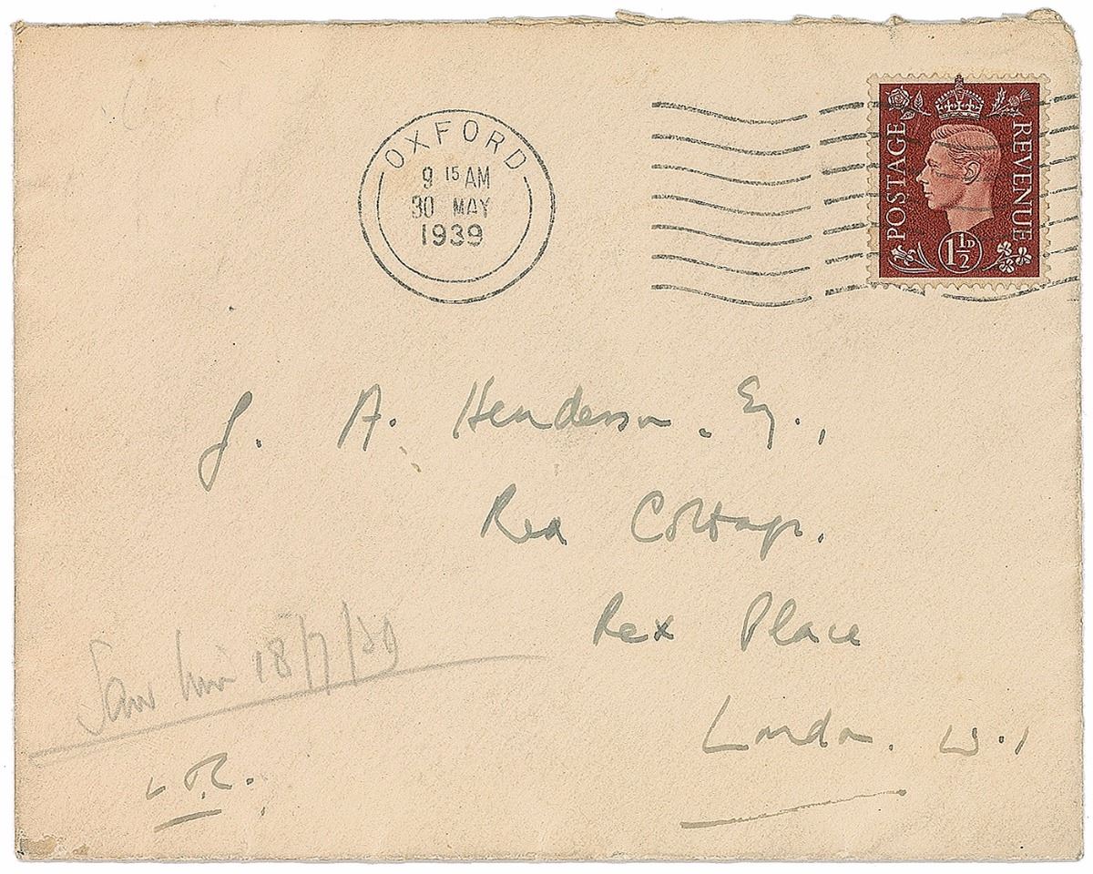 Influential English composer (1872–1958) of symphonies, chamber music, opera, choral music, and film scores. ALS signed “RW,” one page both sides, 4.5 x 7, Oriel College letterhead, May 29, 1939. Letter in his difficult to decipher hand apologizing for his inability to visit London due to “lack of money” and “lack of a car.” In fine condition. Accompanied by the original mailing envelope addressed in his own hand.