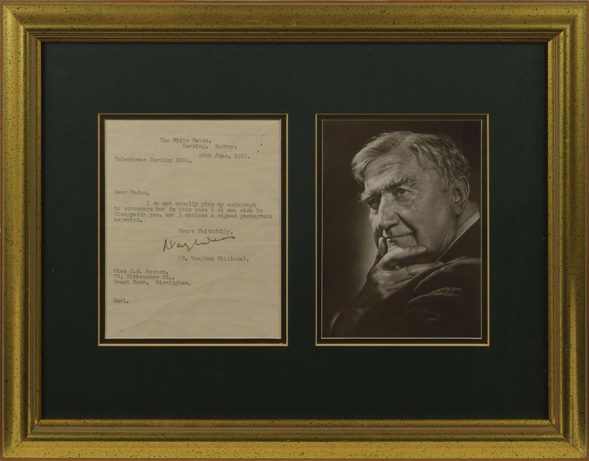 Influential English composer (1872–1958) of symphonies, chamber music, opera, choral music, and film scores. Uncommon TLS signed “R. Vaughan Williams,” one page, 5.25 x 6.75, The White Gates letterhead, June 20, 1951. Letter to Miss J. S. Benton, in full: "I do not usually give my autograph to strangers but in this case I do not wish to disappoint you, and I enclose a signed photograph herewith." Double-matted and framed with a portrait of the composer to an overall size of 18 x 14. In very good condition, with scattered moderate overall creasing.