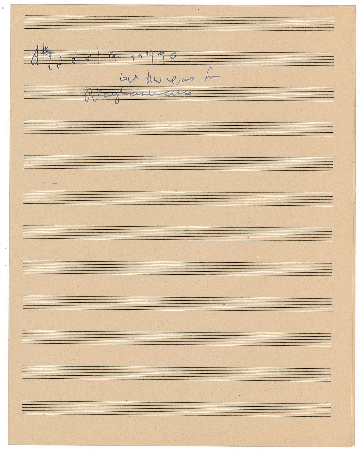 Influential English composer (1872–1958) of symphonies, chamber music, opera, choral music, and film scores. Uncommon AMQS on an off-white 8.75 x 11.25 musically lined sheet, signed in black ink, "R. Vaughan Williams," who pens three bars of music from an unknown work. In fine condition.