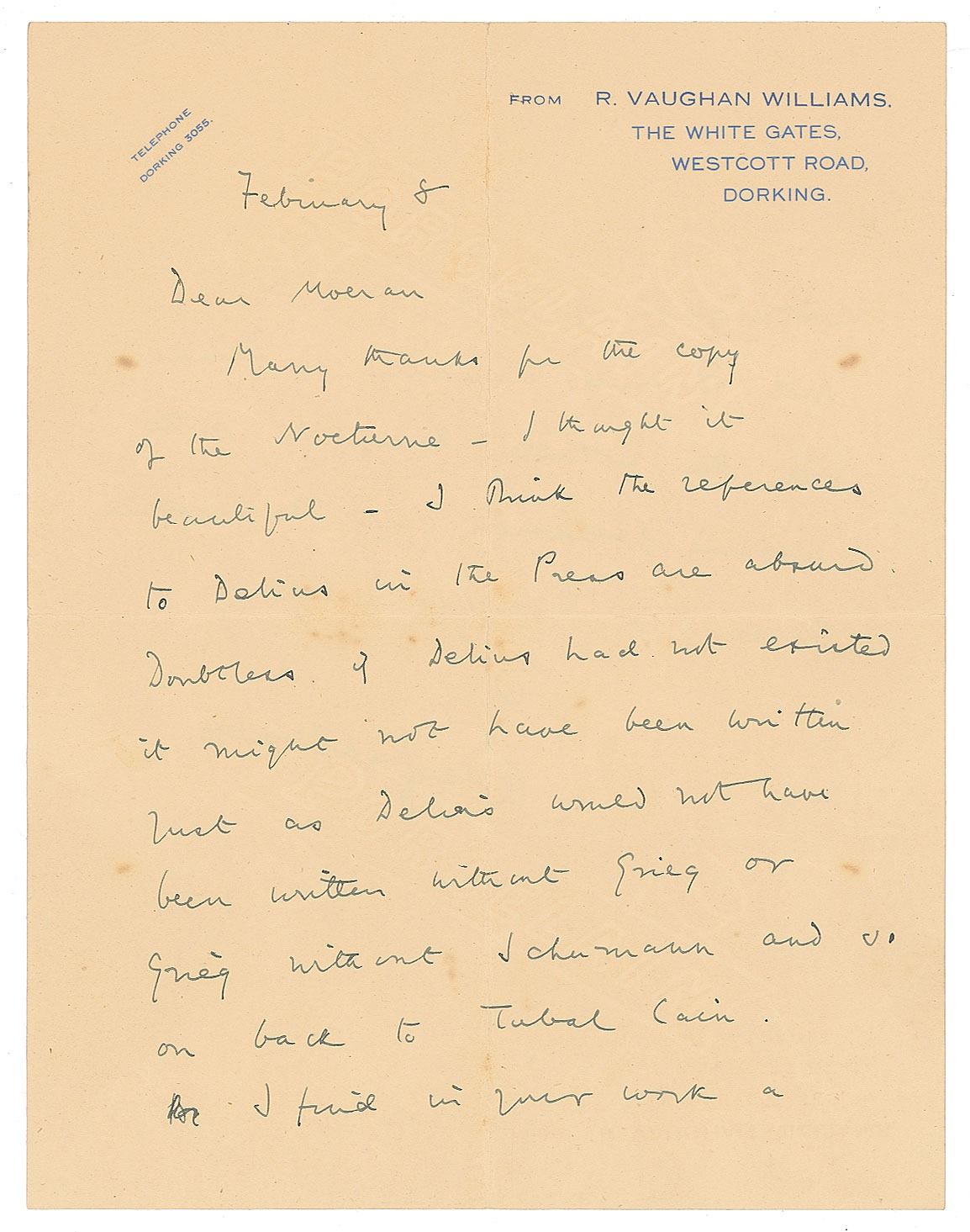 ALS signed “R. Vaughan Williams,” one page both sides, 7 x 9, February 8, [no year]. Letter to English composer Ernest John Moeran, in full: "Many thanks for the copy of the Nocturne. I thought it beautiful. I think the references to Delius in the Press are absurd. Doubtless if Delius had not existed it might not have been written just as Delius would not have been written without Grieg or Grieg without Schumann and so on back to Tubal Cain. I find in your work distinction of style that I fail to find usually in Delius with the notable exception of the Wedding procession (not The Paradise Garden) in Romeo & Juliet." In very good to fine condition, with intersecting folds and scattered light foxing.