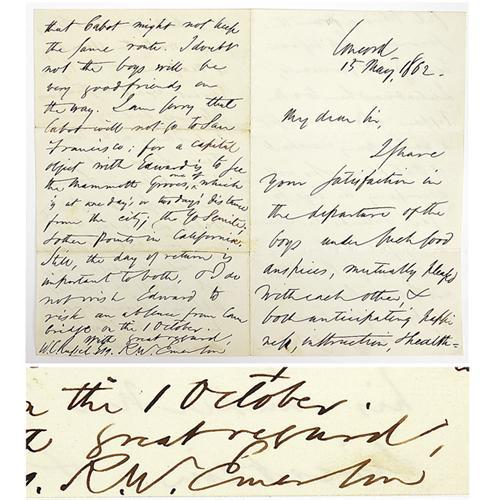 <Our item number 135772><B>Emerson, Ralph Waldo.</B> Autograph letter signed ("R.W. Emerson"), 4pp, Concord, 15 May 1862. To W.C. Russell, regarding a train trip to California that Emerson's son, Edward, and Russells's son, Cabot, were taking to California. Emerson discusses arrangment for the trip and is happy that his son will see "the Mammoth Groves" and "the Yo Semite" in California. Edward had to be back in Cambridge for school in October. Fine. An interesting letter revealing Emerson as a concerned father. <BR>Estimated Value $600 - 800. <BR><BR>Our item number 135772<BR><IMAGES><P ALIGN="CENTER"><IMG SRC="http://www.goldbergcoins.net/liveauction/49jpegs/135772.jpg"> </P></IMAGES>