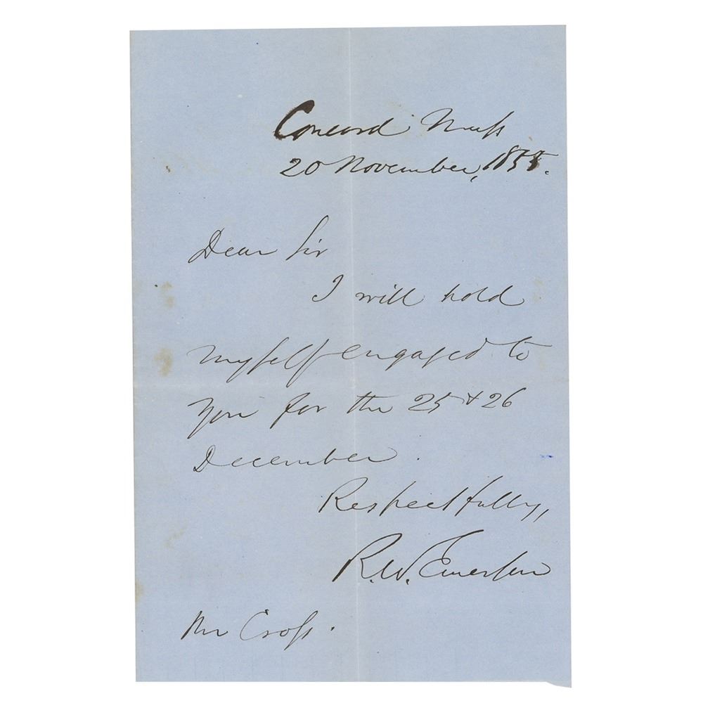 ALS signed “R. W. Emerson,” one page, 4.75 x 7.25, November 20, 1855. Letter to "Mr. Cross," written from Concord, in full: "I will hold myself engaged to you for the 25 & 26 December." In fine condition.