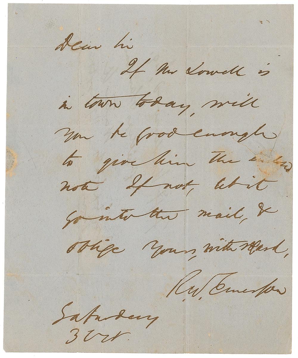 American author and philosopher (1803–1882). whose central role in the Transcendentalist movement earned him a place among the most influential figures in 19th-century literature and thought. ALS signed “R. W. Emerson,” one page, 6.5 x 8, October 3, [1856]. Letter to his publisher F. H. Underwood of Boston trying to get a letter to poet James Russell Lowell. In full: “If Mr. Lowell is in town today, will you be good enough to give him the enclosed note. If not, let it go into the mail & oblige yours.” Reverse bears an address panel in Emerson’s hand to Underwood. In very good condition, with intersecting folds, a few lightly affecting signature, some scattered light toning and soiling, and a repaired tear from wax seal affecting a single word of text. After a speech entitled ‘The American Scholar,’ in 1837, in which Emerson urged Americans to create their own writing style, Lowell called it ‘an event without former parallel on our literary annals.’