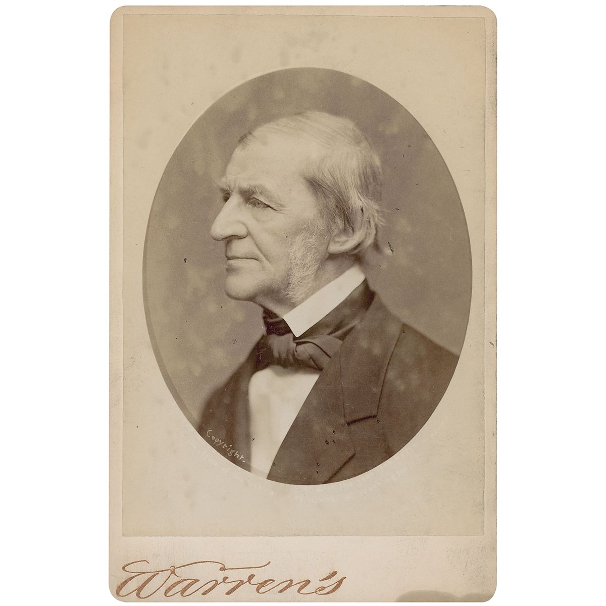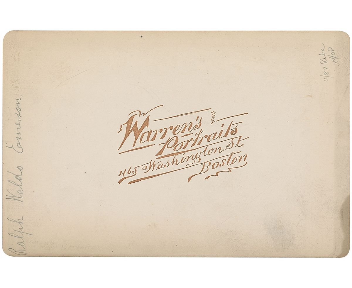 Original 1800s cabinet card, 4.25 x 6.5, of writer Ralph Waldo Emerson by noted studio Warren's of Boston. Photographer's stamp front and back. Sharp and clear image with some aging spots and discoloration. Stain to lower mount corner, plus general light wear and aging. Pencil note and author's name written in pencil on back.