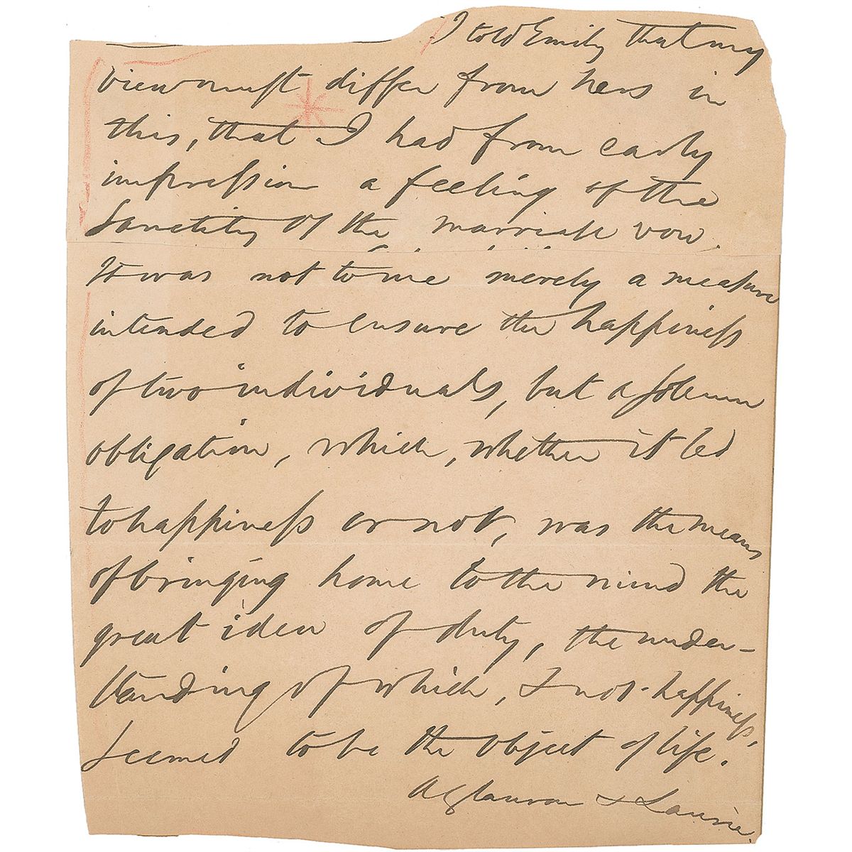Autograph manuscript, one page, 6.5 x 7.75, no date. Emerson pens an interesting moralistic passage on the subject of marriage. In full: “I told Emily [possibly Emily Ervine Drury, a close intellectual confidante of Emerson’s] that my view might differ from hers in this, that I had from early impression a feeling of the Sanctity of the marriage vow. It was not to me merely a measure intended to ensure the happiness of two individuals, but a solemn obligation, which, whether it led to happiness or not, was the means of bringing home to the mind the great idea of duty, the understanding of which, & not happiness, seemed to be the object of life.” The first five lines were closely cropped from a different page and affixed at the top of the sheet, and the text bears a few light editorial pencil notations. In fine condition. Accompanied by a blade of grass affixed to an off-white slip, labeled “From the grave of Ralph Waldo Emerson, Sleepy Hollow Graveyard, June ’86.”