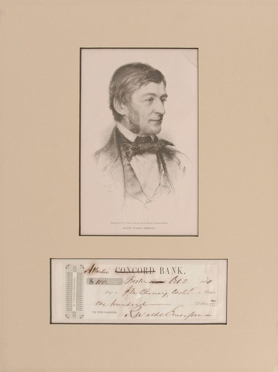 Bank check, 7.5 x 2.75, filled out and signed by Emerson, “R. Waldo Emerson,” payable to M. Cheney, Cash’r, for $100, October 2, 1860. In very good to fine condition. Check appears to be affixed to a larger mount, and matted and framed with an engraved portrait of Emerson. In fine condition, with scattered toning and soiling.