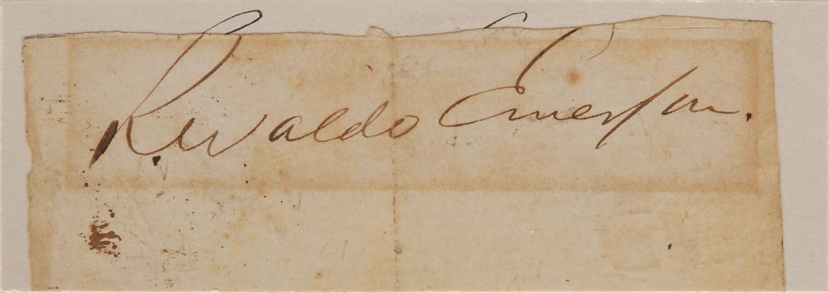 Ink signature, “R. Waldo Emerson,” on an off-white 3.5 x 1.25 slip affixed to a slight larger card bearing an engraving signature. In very good condition, with a block of toning, light soiling, and the tops of the engraving’s signature poking up behind the tops of the trimmed capital letters.