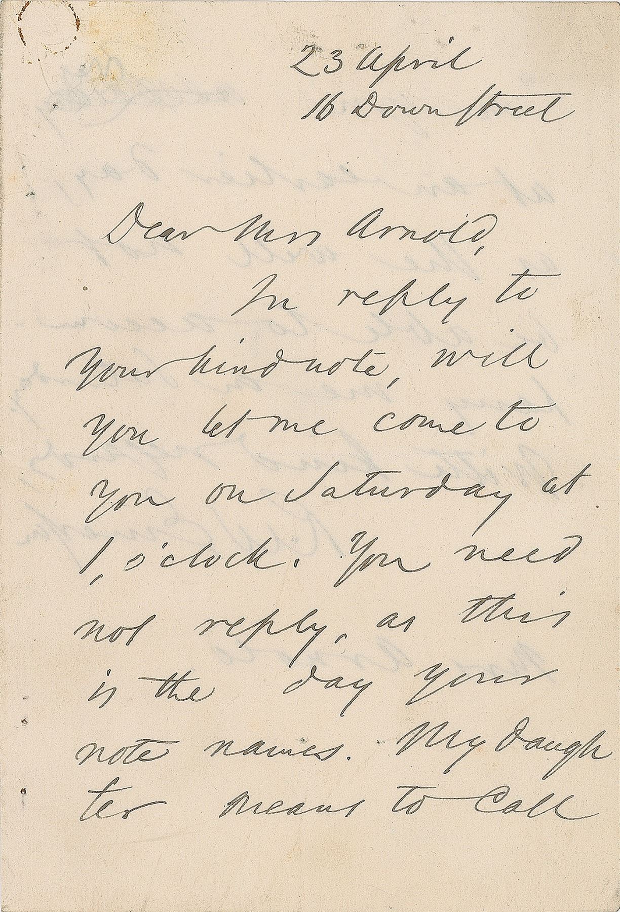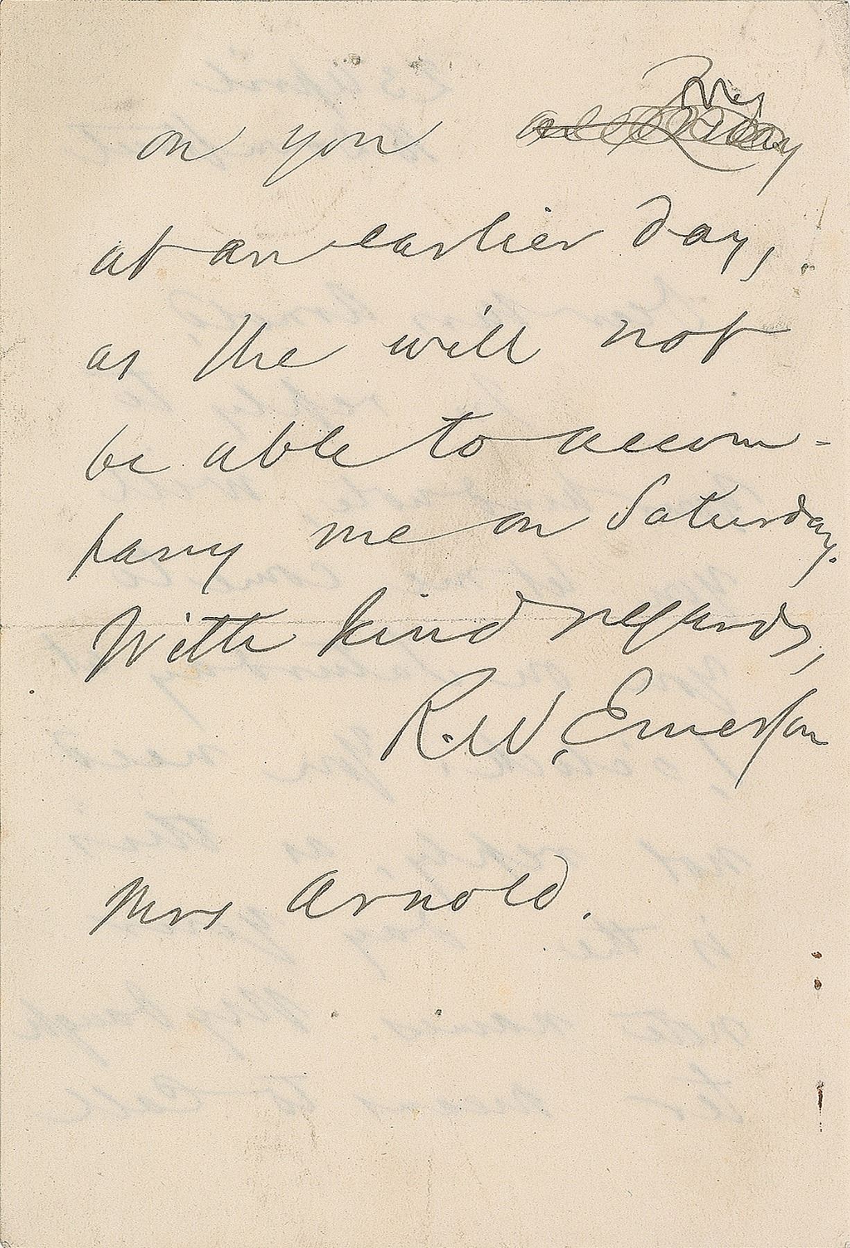 ALS signed “R. W. Emerson,” one page both sides, 3.5 x 5.25, April 23. Letter to Mrs. Arnold, in part: "In reply to your kind note, will you let me come to you on Saturday at 1 o'clock. You need not reply, as this is the day your note names. My daughter means to call on you at an earlier day, as she will not be able to accompany me on Saturday." In fine condition, with staple holes to the left edge, and a small rust stain to the upper left corner. Accompanied by an unsigned portrait.