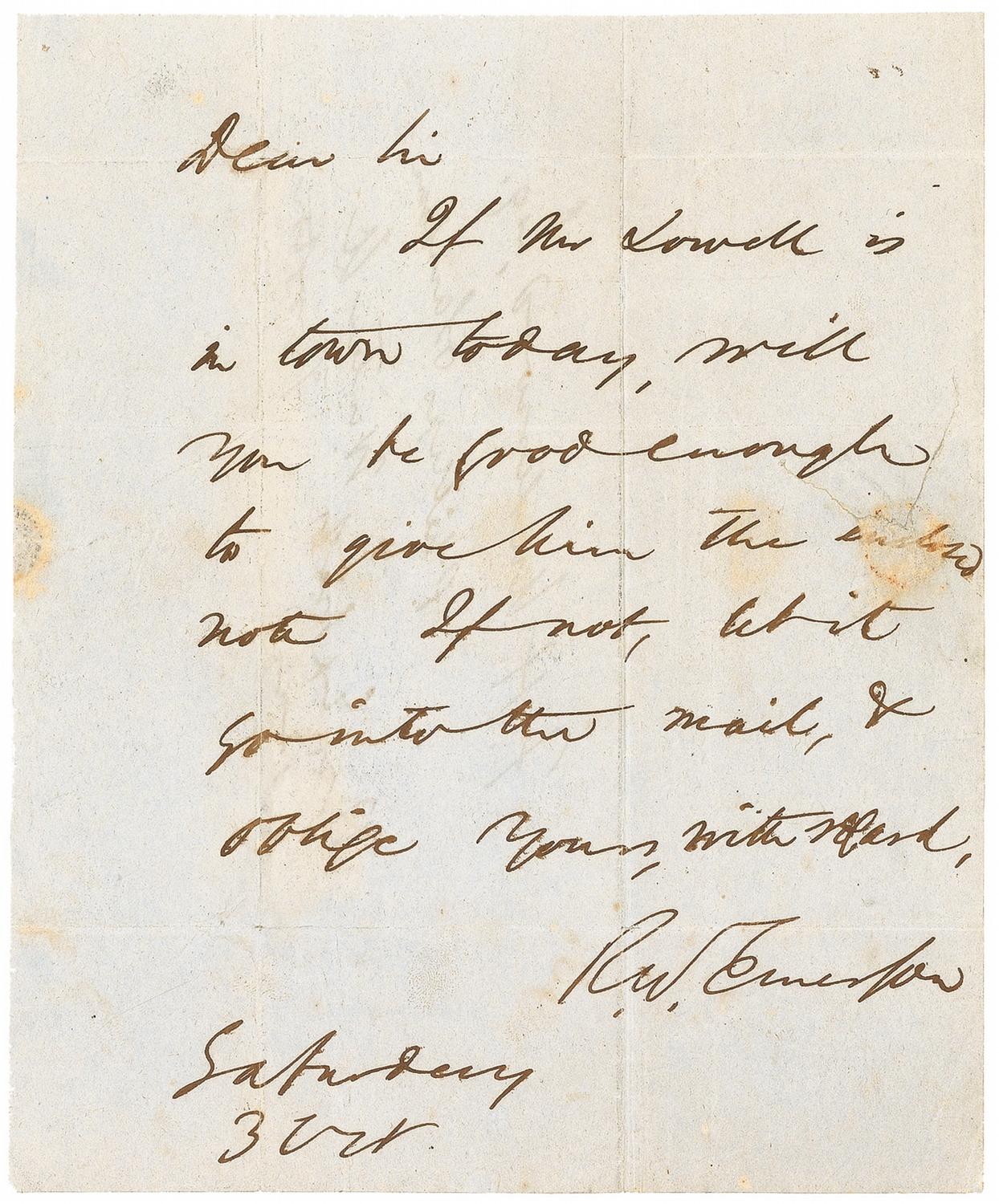 American author and philosopher (1803–1882). whose central role in the Transcendentalist movement earned him a place among the most influential figures in 19th-century literature and thought. ALS signed “R. W. Emerson,” one page, 6.5 x 8, October 3, [1856]. Letter to his publisher F. H. Underwood of Boston trying to get a letter to poet James Russell Lowell. In full: “If Mr. Lowell is in town today, will you be good enough to give him the enclosed note. If not, let it go into the mail & oblige yours.” Reverse bears an address panel in Emerson’s hand to Underwood. In very good condition, with intersecting folds, a few lightly affecting signature, some scattered light toning and soiling, and a repaired tear from wax seal affecting a single word of text. After a speech entitled ‘The American Scholar,’ in 1837, in which Emerson urged Americans to create their own writing style, Lowell called it ‘an event without former parallel on our literary annals.’