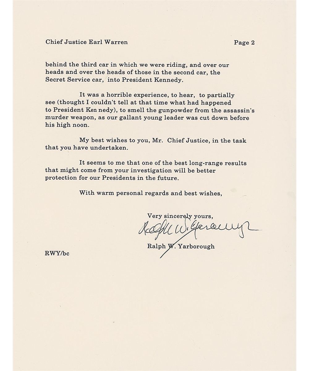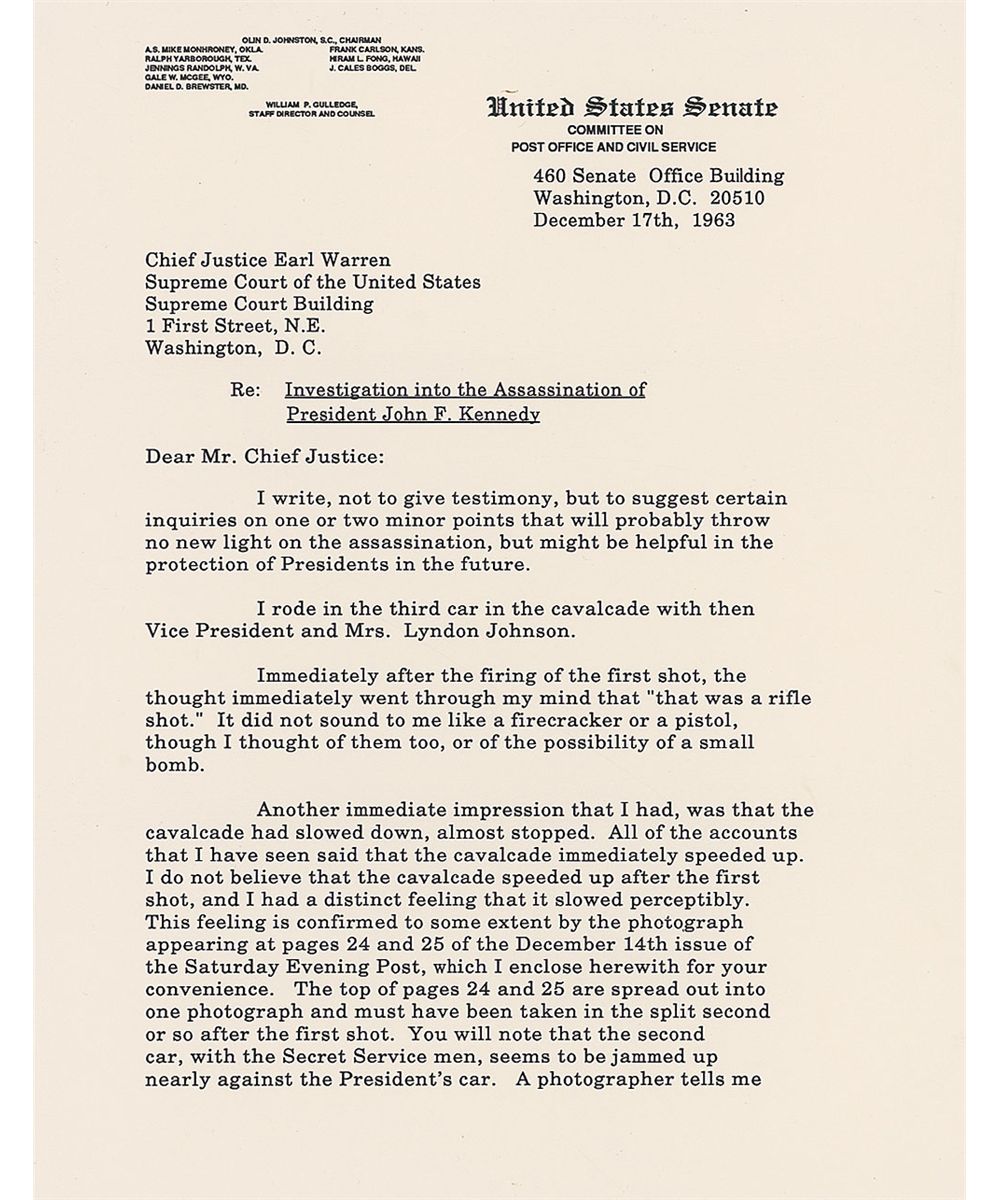 Senator from Texas (1903–1996) who rode in the convertible with LBJ during the motorcade. Souvenir typescript of Yarborough’s statement to Chief Justice Earl Warren, two pages, 8.5 x 11, signed at the conclusion in ballpoint, “Ralph W. Yarborough.” In part: “I rode in the third car in the cavalcade with then Vice President and Mrs. Lyndon Johnson. Immediately after the firing of the first shot, the thought immediately went through my mind that ‘that was a rifle shot.’ It did not sound to me like a firecracker or a pistol, though I thought of them too, or of the possibility of a small bomb. Another immediate impression that I had, was that the cavalcade has slowed down, almost stopped…It was a horrible experience to hear, to partially see (though I couldn’t tell at the time what had happened to President Kennedy), to smell the gunpowder from the assassin’s murder weapon, as our gallant young leader was cut down before his high noon.” In very fine condition.