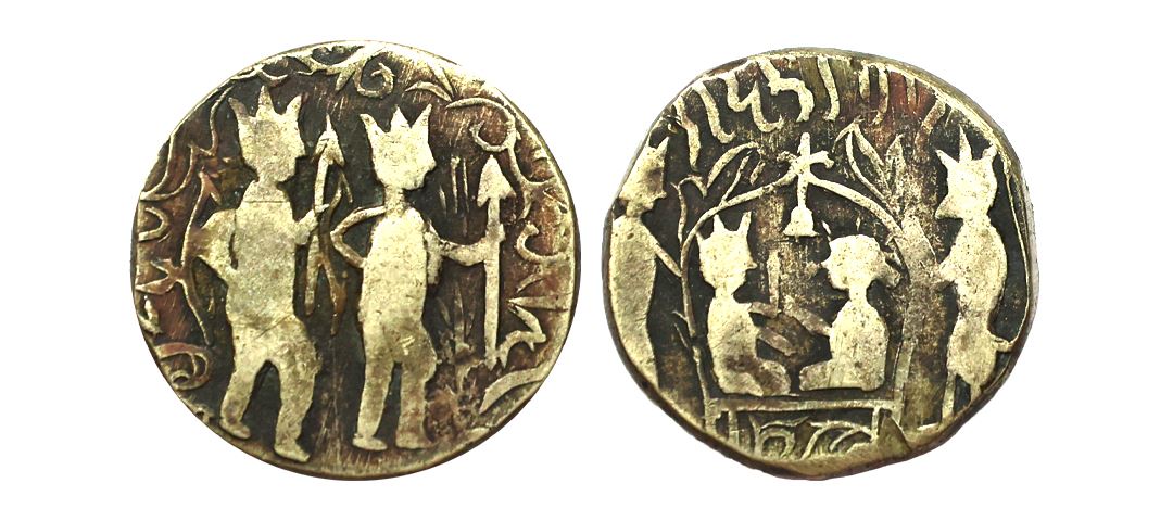 Ram Darbar, Silver Temple Token, 11.59 gms, Obv. Durbar scene, Rama and Sita seated on durbar platform, attendant standing on both sides holds parasol above, Rev. Lord Ram & Lakshman, very fine, scarce.
