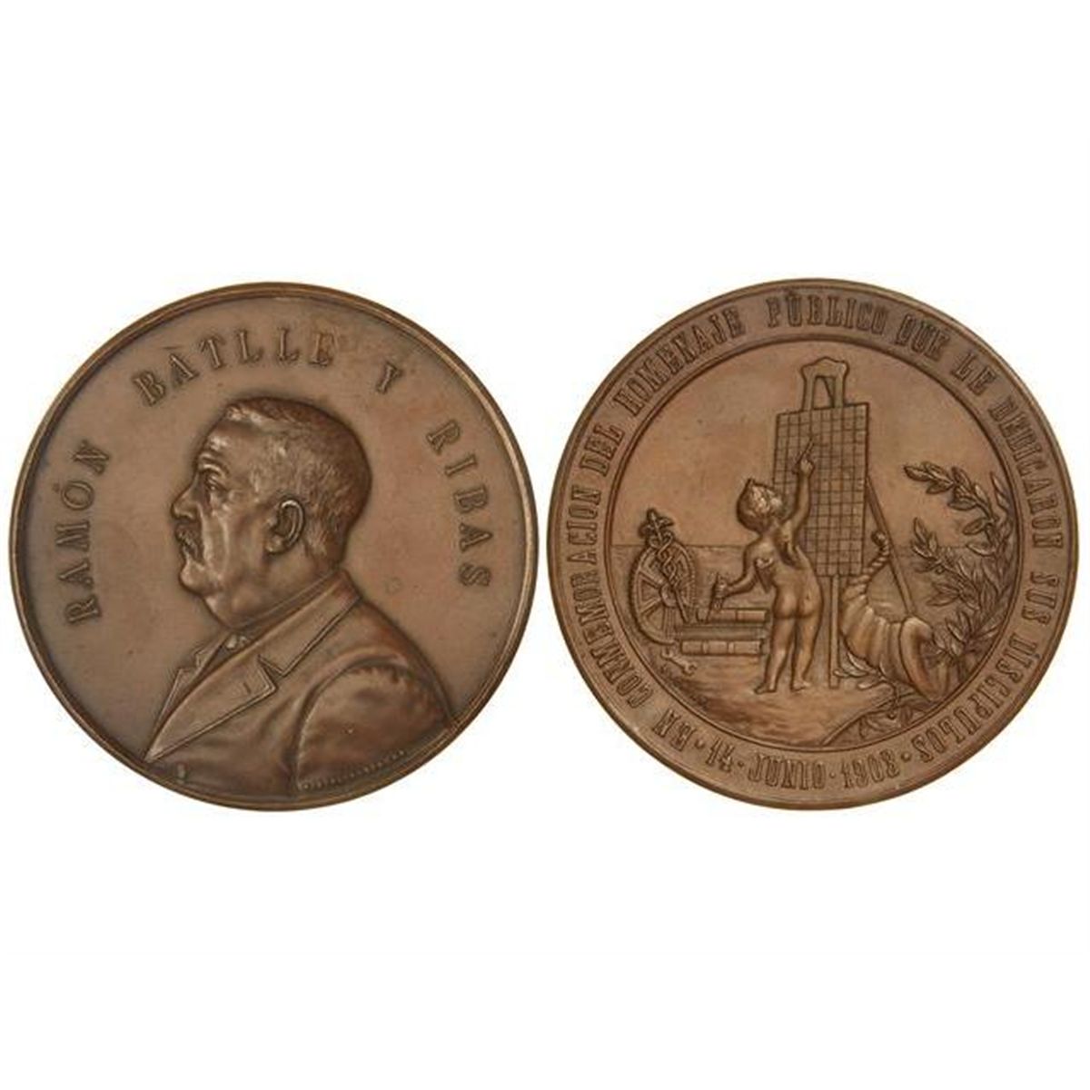 Ramón Batlle y Ribas. - 14 Junio 1903. - Anv.: Busto a izquierda. Rev.: EN CONMEMORACIÓN DEL HOMENAJE PÚBLICO QUE LE DIERON SUS DISCÍPULOS. Cupido pintando lienzo, cornucopia, laurea y atributos de la ciencia y la industria. AE. Ø 68 mm. EBC+. - -