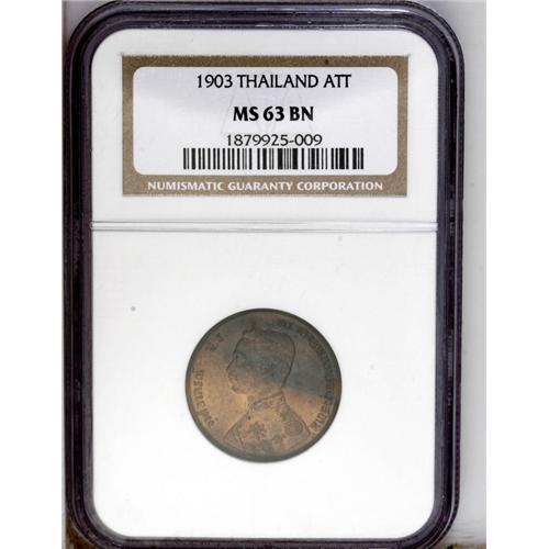 <B>Rama V 1 Att RS122 (1903),</B></I> KM-Y22, MS63 Brown NGC. Noticeable original mint-red color remains on the obverse.
