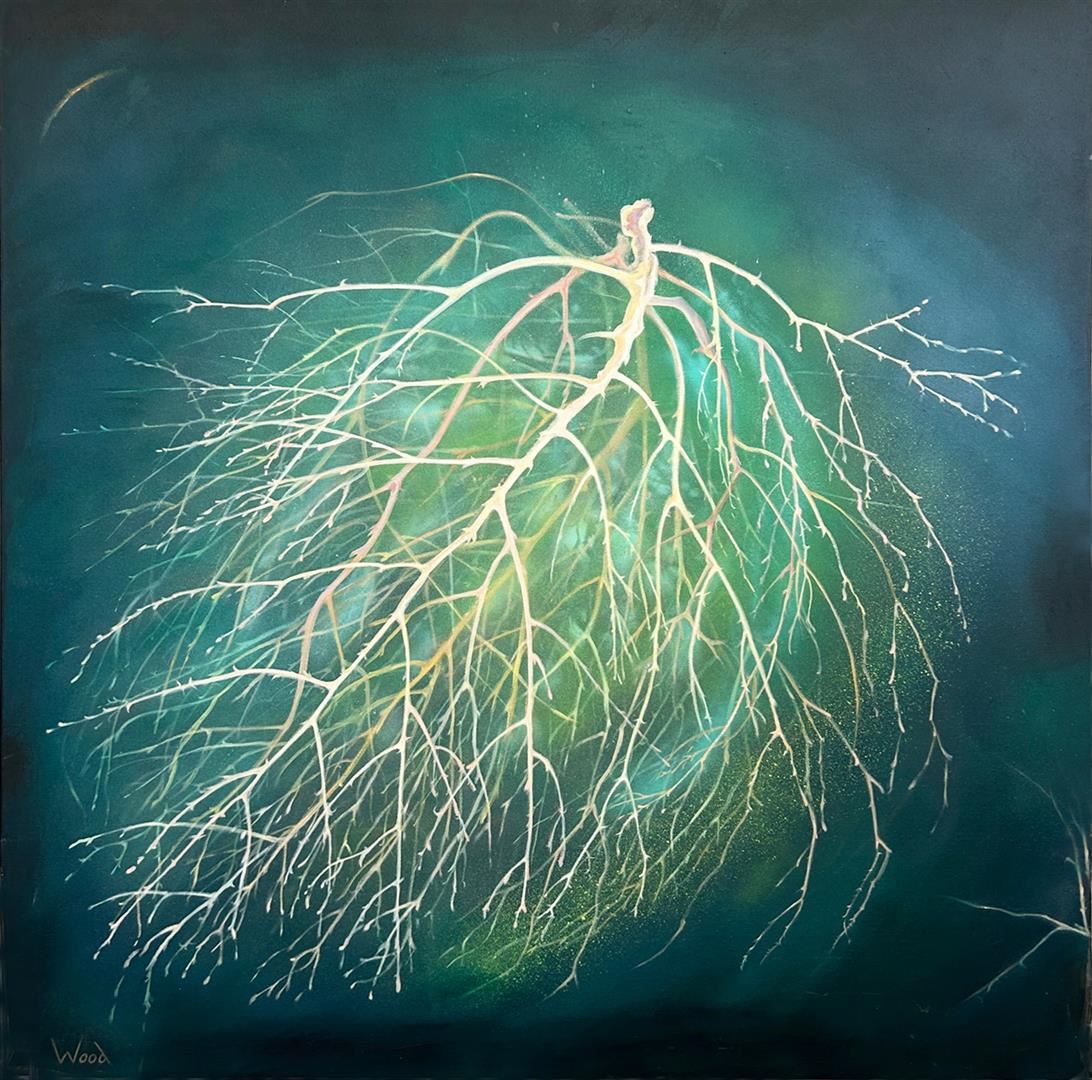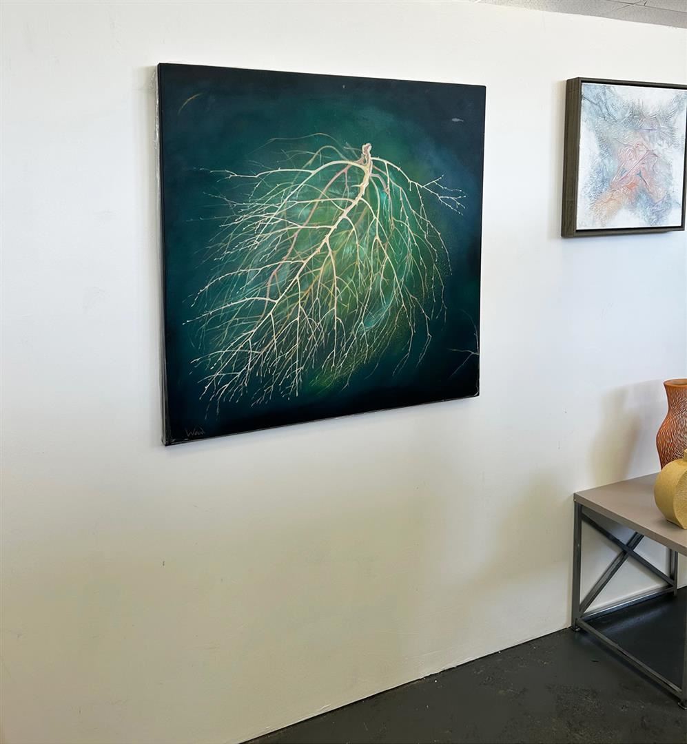Ethereal impression of a tumbleweed on a dark green background. 36x36" Original acrylic on stretched canvas by Marion Wood. COA