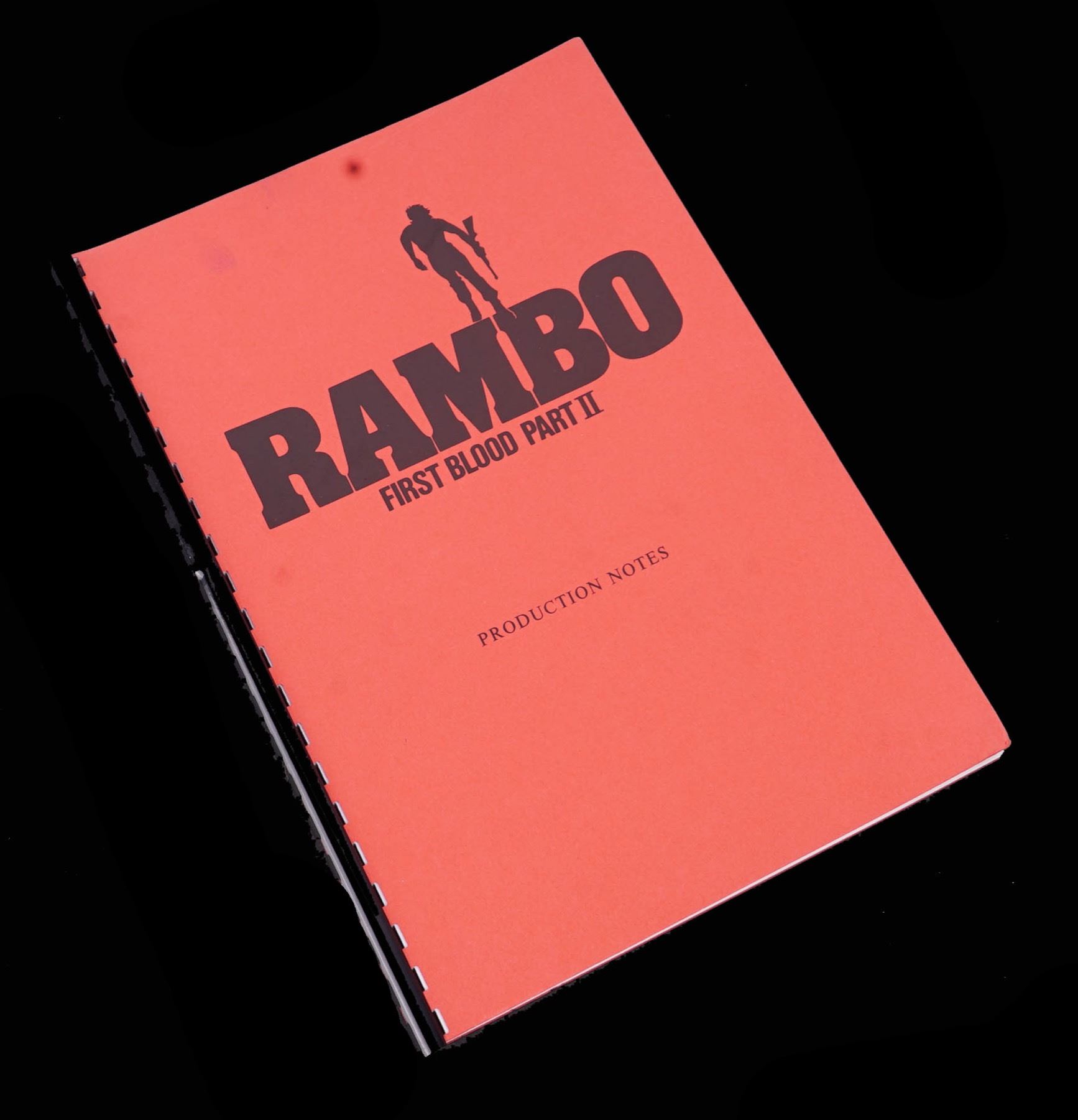 Original production notes for the Sylvester Stallone action film Rambo: First Blood Part II. Rambo returns to the jungles of Vietnam on a mission to infiltrate an enemy base-camp and rescue the American POWs still held captive there. This is an original packed of production information given out to cast and crew members before filming began. This set features a red front and back cover that is spiral bound on the left hand side, and the front cover features a silhouette of the main character with the title “Rambo First Blood Part II Production Notes”. This piece remains in excellent, production used condition.