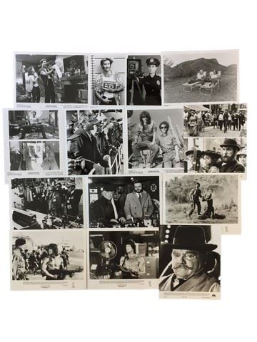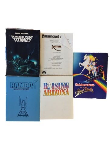 Collection of 5 press kits with black and white publicity stills included, sized mainly 8x10's, from various movie studios. (1980's). From Tri Star Pictures "Rambo First Blood II" (1982) starring Slyvester Stallone as John Rambo, Richard Crenna as Sam Trautman, and Brian Dennehy as Hope Sheriff, includes 12 stills. From Martin Starger Production "Raise The Titanic" (1980) starring Jason Robards as Admiral James Sandecker, Richard Jordan as Dirk Pitt, and David Selby as Gene Seagram, includes 23 stills. From Paramount Pictures "Ragtime" (1981) starring Elizabeth McGovern as Evelyn Nesbit, James Cagney as Police Commisioner, and howard Rollins as Coalhouse, includes 6 stills. From 20th Century Fox "Raising Arizona" (1987) starring Nicolas Cage as H.I., Holly Hunter as Ed, and Trey Wilson as Nathan Arizona Sr., includes 5 stills. From Warner Brothers "Rainbow Bright" (1985) starring Pat Fraley as Lurky, Peter Cullen as Murky, and Andre Stojka as Starlite, no stills included.