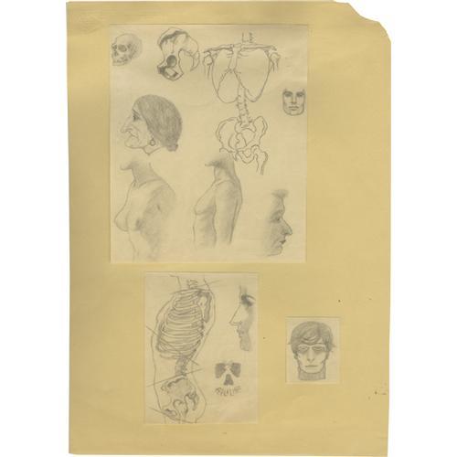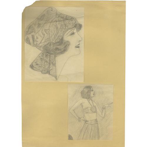 <B>Natacha Rambova Two-Sided Panel with Pencil Sketches, Including a Drawing of Conrad Veidt from "Cabinet of Dr. Caligari."</B></I> The dark side of Natacha Rambova reveals itself in this fascinating two-sided, pencil-sketched panel, dating from the early 1920s. One side features two profile drawings of attractive young ladies, circa 1922, one smiling, one dancing. The other side gets creepy: a crone, a skull face, male and female torsos and profiles, skeletons, and -- most notably -- a superb sketch of Conrad Veidt as Cesare, the "somnambulist" of the milestone horror film <I>The Cabinet of Dr. Caligari</B></I> (1920). The Veidt drawing is small (2" x 2") but has outstanding detail, especially in its shadowy and frightening eyes. An art study of a notable actor in an iconic performance, drawn by another famed cinema personality of the era, makes this very desirable indeed -- especially considering the highly collectible classic horror genre. Very Fine condition. This is truly haunting artwork, created by a notorious "dark lady" of early Hollywood.<BR><BR><b>Shipping:</b> Flat Material, Small (<a target="_blank" href="http://www.heritageauctions.com/common/shipping.php">view shipping information</a>)