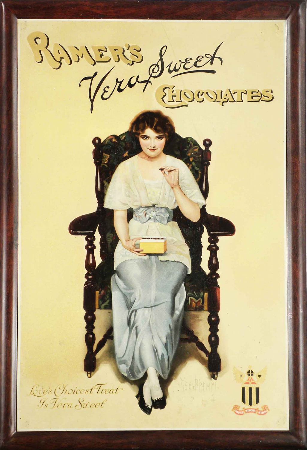 Ramer's Vera Sweet Chocolates Self Framed Tin Over Cardboard String Hanger Sign. "Love's Choicest Treat is Vera Sweet". Geo. Brehm artist, 1914. Extensive in painting to chair and back ground otherwise good condition. 13 X 19 inches.