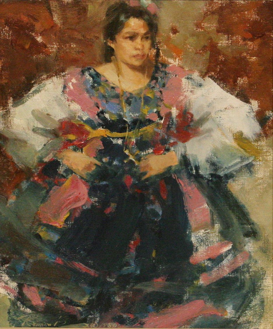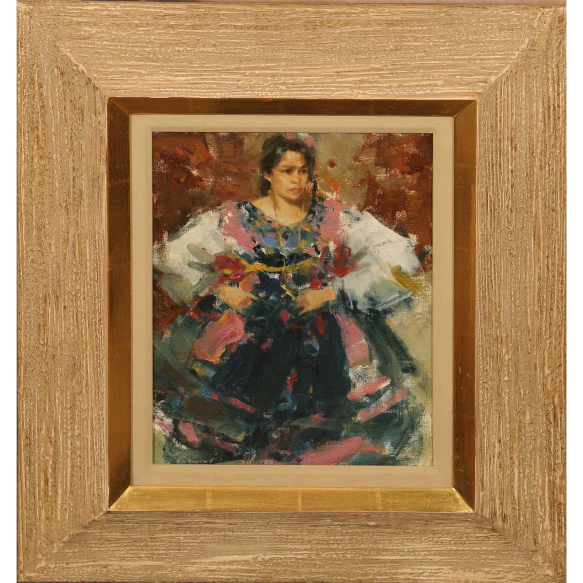 Ramon Kelley (1939 - ). Mexican Peasant Dress. 14" x 11" oil on canvas. Signed lower left: Ramon Kelley © 1980. Also signed and titled verso.