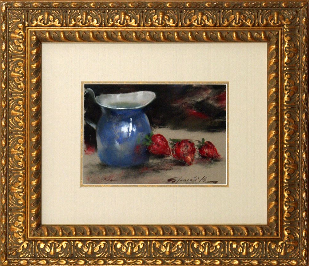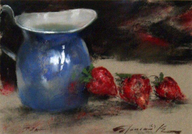 Ramon Kelley (b. 1939). Strawberries & Milk. 7" x 10" pastel. Signed lower right: © Ramon Kelley . (est. $800-1,200). CONDITION REPORTS: www.auctioninsantafe.com/docs/cr2012.pdf