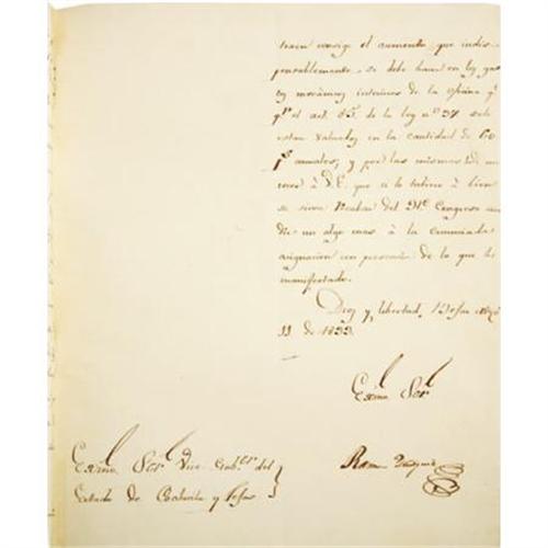 <B>Ramon Musquiz Letter Signed as Political Chief of the Department of Texas.</B></I> Bejar. March 11, 1833. Three pages, Folio sheet, folded. Penned in Spanish in an unknown hand. Concerns the important manuscript collection that is known today as the Bexar Archives.<BR><BR>In this letter Ramon Musquiz informs the vice-governor of the state of Coahuila y Texas of his need for additional funds to organize and administer the archives at Bejar. Musquiz complains that he has only a secretary and a lone scribe to assist with the massive undertaking, and humbly requests permission to hire an additional scribe. Boldly signed by Musquiz on the final leaf, in the name of "<I>Dios y libertad</B></I>," with his decorative rubric alongside.<BR><BR>Musquiz's appeal for more funds was no doubt prompted by the huge amount of material being produced by the emigration of American colonists to Texas. At the time of this writing Musquiz had been involved in the Mexican administration of Texas for some ten years. A supporter of colonization and a friend of Stephen F. Austin, Musquiz would become vice-governor of Texas in 1835.<BR><BR>The Bejar Archives (now the <I>Bexar Archives,</B></I> housed at the University of Texas at Austin) were first organized in 1717 and administered by the ruling Spanish and Mexican authorities in Texas, whose goal it was to record every official document, letter, broadside, etc., that concerned the civilian, political, and most importantly, the military activities of the area. Today, it is known as the most complete and well documented reference of early Texas history. An interesting letter detailing the administration and growth of this important Texas archive. Enclosed in a brown half-calf case with tan cloth boards and gilt letting on spine. Two staples and a strip of opaque tape along vertical fold do not detract from this beautifully penned letter. In fine condition. <I>From the collection of Darrel Brown.</B></I><BR><BR><B>Reference:</B></I> <I>The Handbook of Texas Online</B></I>. <BR><BR><b>Shipping:</b> Books & Catalogs (<a target="_blank" href="http://www.heritageauctions.com/common/shipping.php">view shipping information</a>)