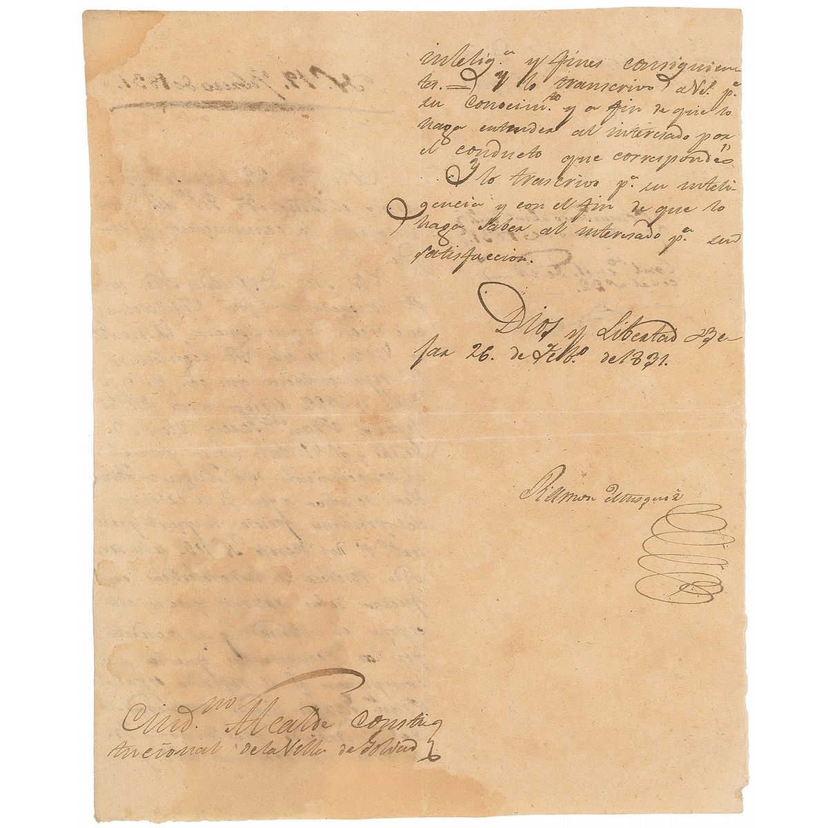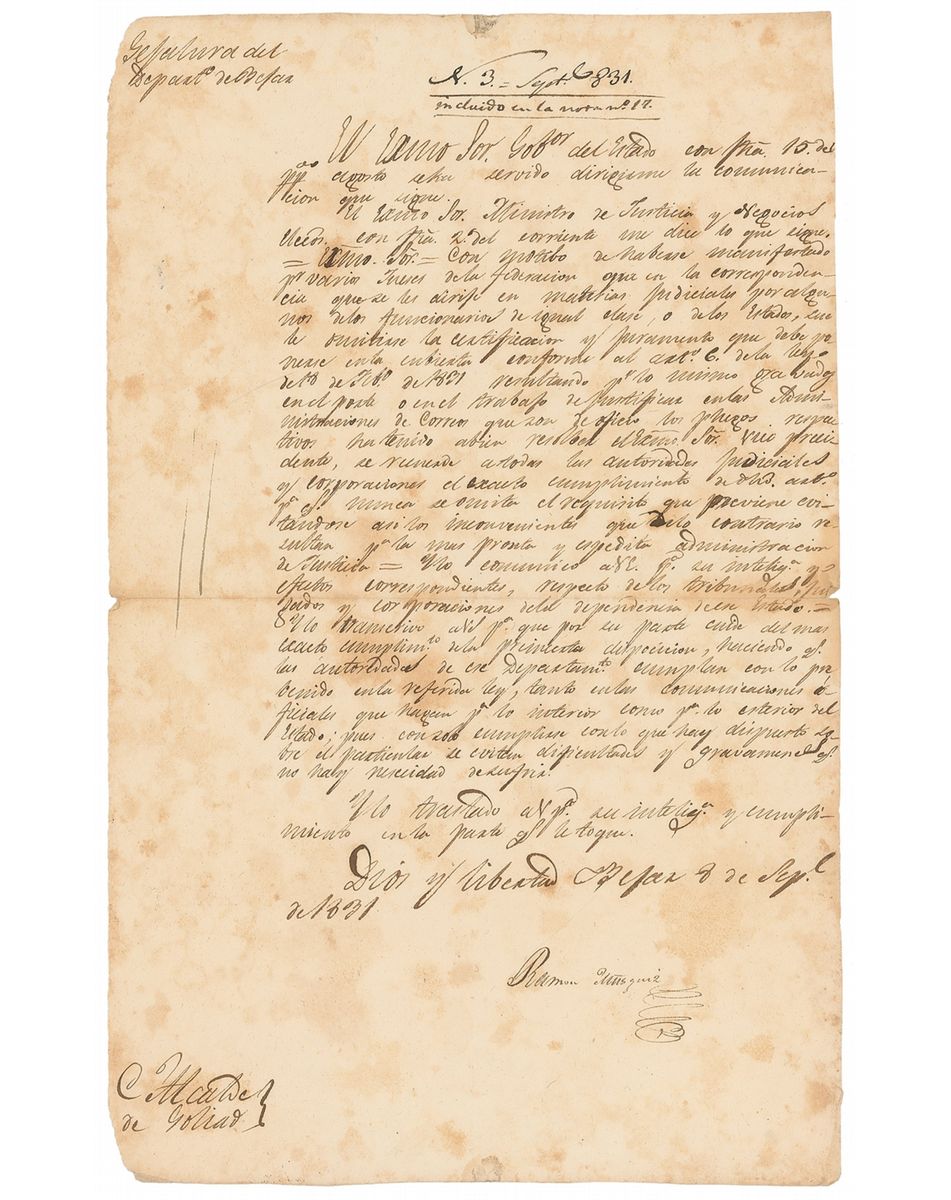 (4) LS, one page, 8 x 13, September 8, 1831. In part (translated): "Because several federal judges have manifested that on the correspondence they have received from other federal judges or state judges regarding judicial matters it has been omitted the certification and oath that must be included on the cover…the Most Excellent Mr. Vice-President has seen fit to resolve that all judicial authorities and corporations be reminded of the exact compliance to the said article so that the requisite it prescribes is never omitted, avoiding thus the inconveniences that would otherwise result for a most prompt and expedite administration of Justice…"