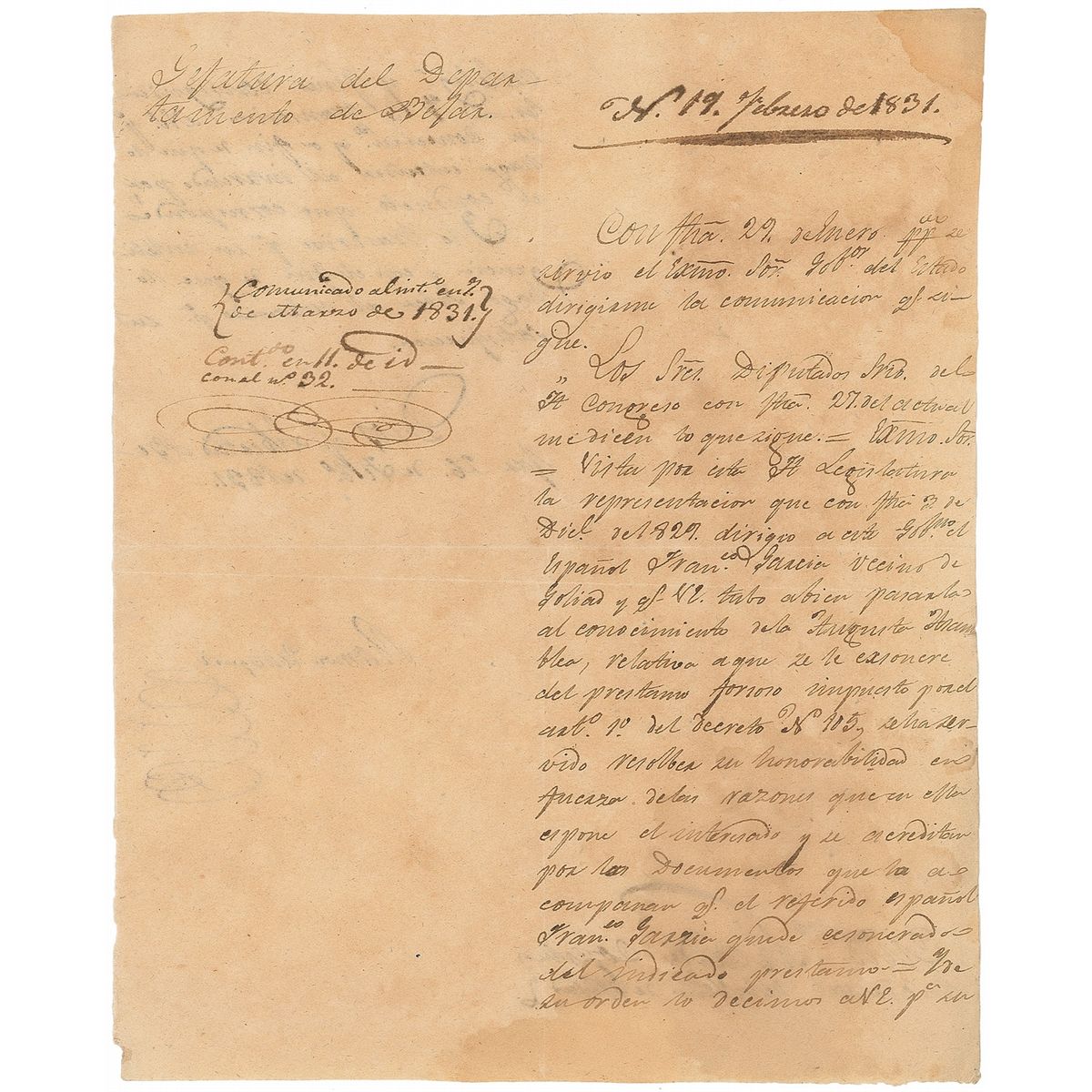 (1) LS, one page, both sides, 6.25 x 8, February 26, 1831. In part (translated): “[The] declaration dated 3 December 1829, addressed to this Government by the Spaniard Francisco García, resident of Goliad…relative to his desired exoneration from the forced loan imposed by article 1 of decree no. 105, has seen fit to resolve to comply, in virtue of the reasons expressed by the interested party in his declaration and evidenced by the documents that accompany the said declaration, so that the said Spaniard Francisco García be exonerated from the above mentioned loan…"