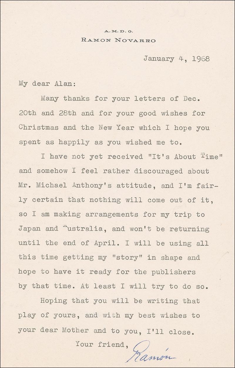 TLS signed “Ramon,” one page, 5.5 x 8.5, personal letterhead, January 4, 1968. Letter to a friend. In part: “I have not yet received ‘It’s About Time’ and somehow feel rather discouraged about Mr. Michael Anthony’s attitude, and I’m fairly certain that nothing will come out of it, so I am making arrangements for my trip to Japan and Australia, and won’t be returning until the end of April. I will be using all this time getting my ‘story’ in shape and hope to have it ready for the publishers by that time.” In fine condition.
