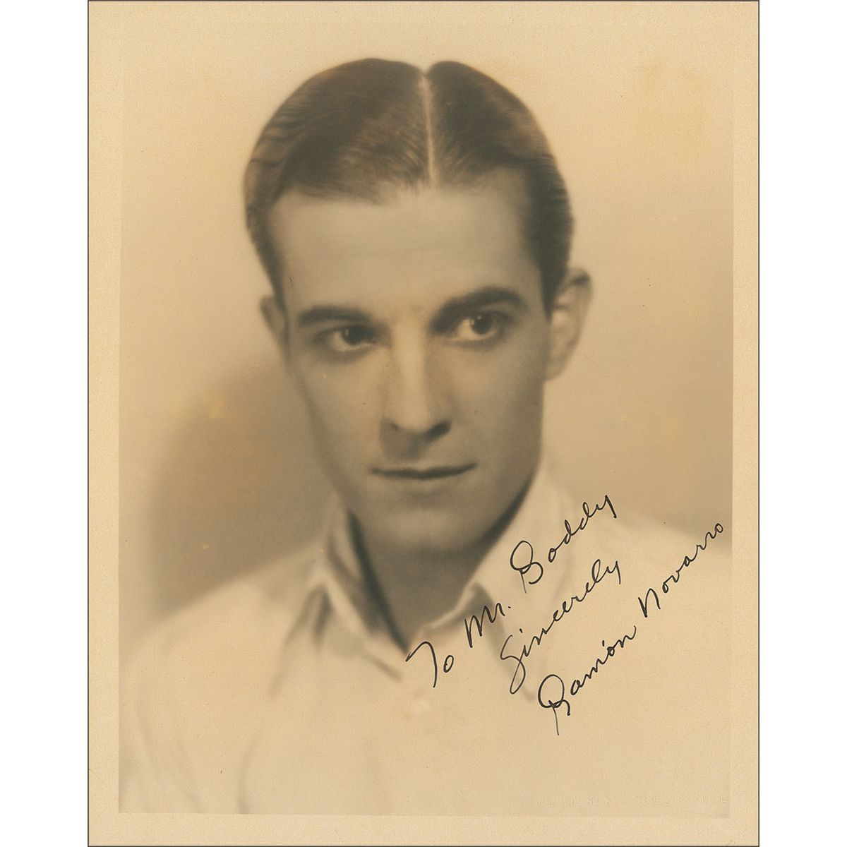 Mexican actor (1899–1968) whose rising popularity among female moviegoers resulted in his being billed as the ‘New Valentino.’ In 1925 he appeared in his most famous role, as the title character in Ben-Hur: A Tale of the Christ. On October 30, 1968, Novarro was savagely beaten in his North Hollywood home by two young hustlers. They had heard, in error, that he had thousands of dollars locked away somewhere in his home. They never found any money, and Novarro was discovered dead the next day by his servant. Vintage sepia matte-finish 8 x 10 Clarence Sinclair Bull photo, signed and inscribed in fountain pen “To Mr. Biddy, Sincerely, Ramon Novarro.” In fine condition, with some slight discoloration to the facial area and background of the image from adhesive remnants on the reverse.