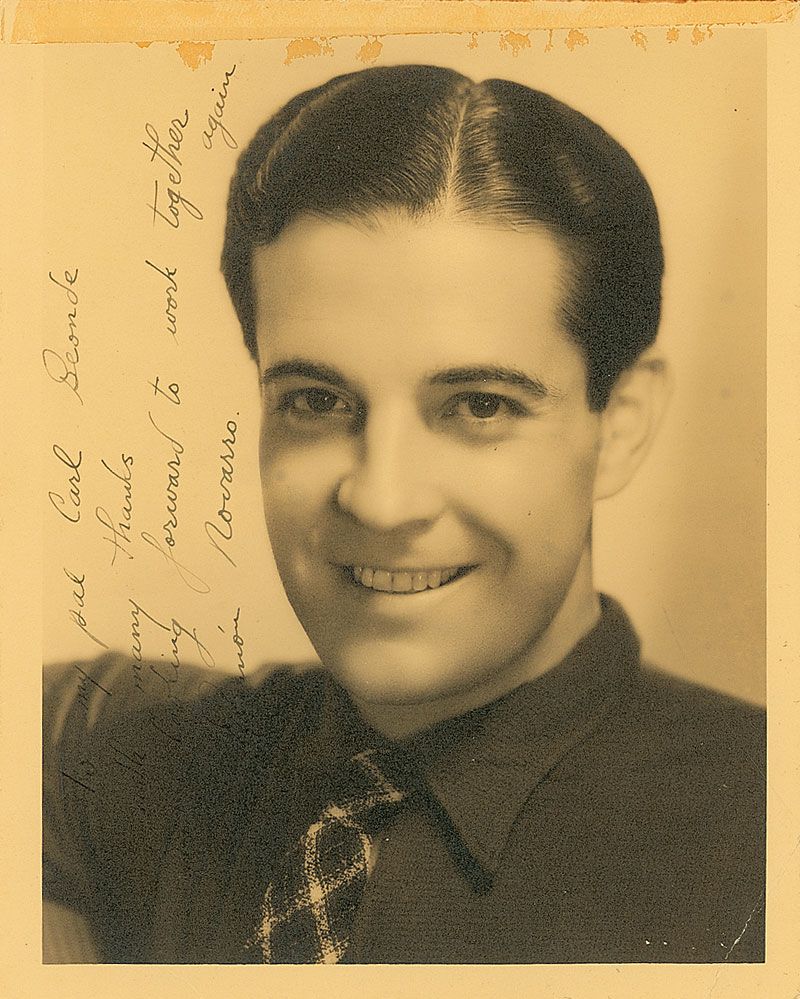 Vintage sepia matte-finish 8 x 10 MGM publicity portrait by George Hurrell, signed and inscribed in fountain pen to a prop master, “To my pal Carl Beonde, with many thanks and looking forward to work together again, Ramon Novarro.” In very good condition, with a crease to the lower right corner, toned mounting remnants along top border, and poor contrast to portions of the inscription and signature against the dark background.