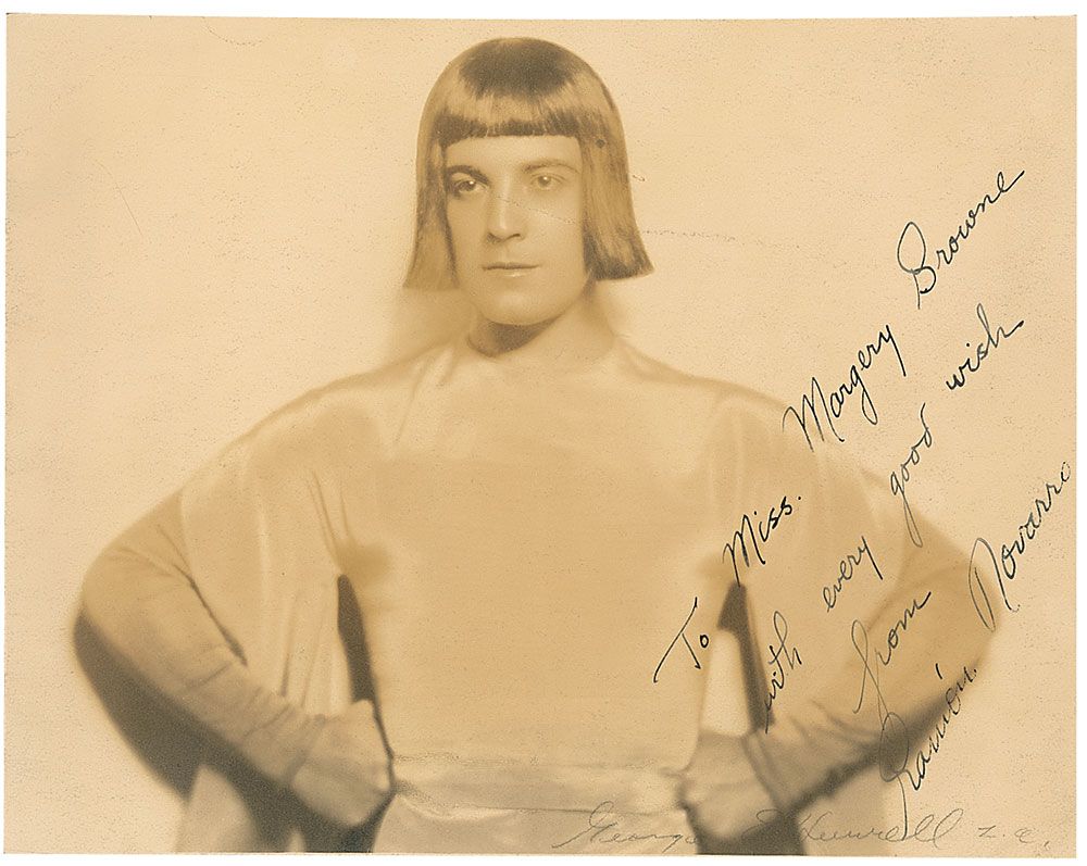 Mexican actor (1899–1968) whose rising popularity among female moviegoers resulted in his being billed as the ‘New Valentino.’ In 1925 he appeared in his most famous role, as the title character in Ben-Hur: A Tale of the Christ. On October 30, 1968, Novarro was savagely beaten in his North Hollywood home by two young hustlers. Vintage sepia matte-finish 9.25 x 7.25 Hurrell photo of Novarro in one of his early roles, signed and inscribed in fountain pen “To Miss Margery Browne, with every good wish from Ramon Novarro.” A pencil notation written along the bottom edge reads, “George Hurrell L. A.” Slightly trimmed edges and a horizontal crease through portion of facial area, otherwise fine condition.