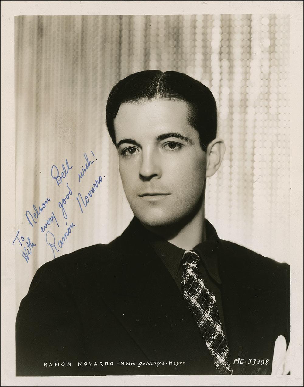 Vintage glossy 8 x 10 MGM publicity photo, signed and inscribed later in blue ink “To Nelson Bell, with every good wish! Ramon Novarro.” A few light brushes to inscription, and some scattered light surface marks and creases, otherwise fine condition.