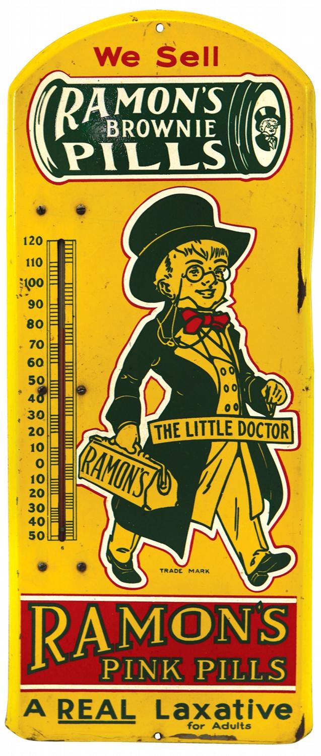 Ramon's Laxative advertising thermometer, litho on metal, VG cond w/some edge wear, 21"H x 9"W.