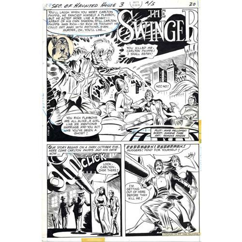<B>Ramona Fradon - Secrets of the Haunted House #3 Page Original Art, Group of 4 (DC, 1983).</B></I> Rich playboy Carlton Phipps hasn't got a "ghost" of a chance to get away with murder, as you'll find out in these pages penciled and inked by Ramona Fradon. Included here are pages 1, 5, 6, and 7 from the seven-page story, "The Swinger," written by Mike Pellowski. Each page has an image area of 10" x 15". Aside from some staining along the left edge of page 5, and tape stains at the edges of each page, the pages average in Very Good condition.