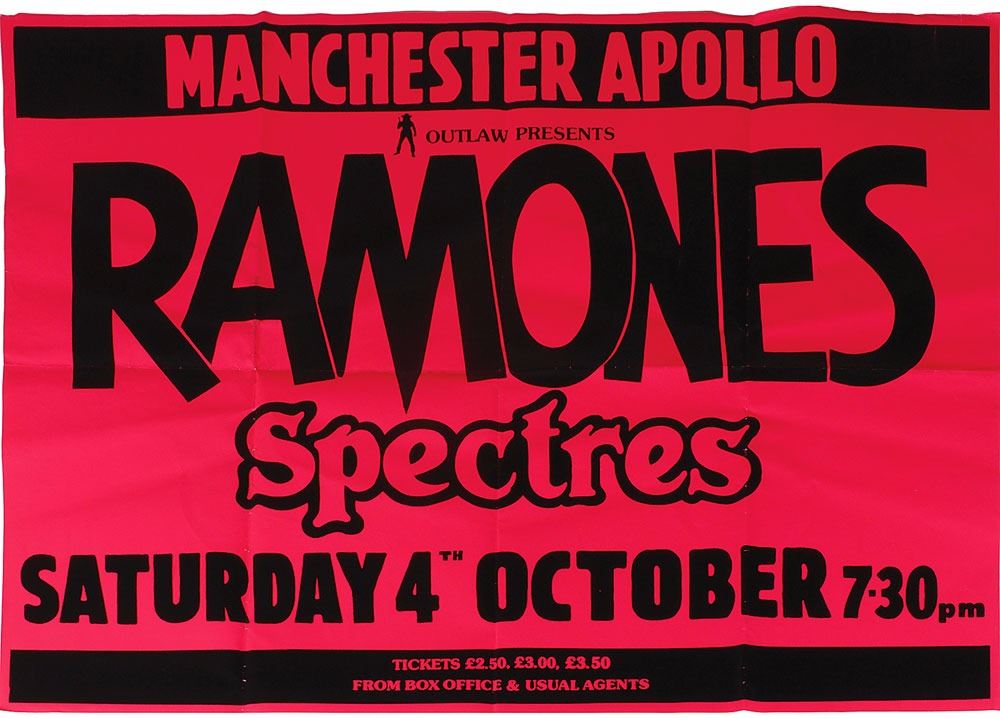 Hot pink-and-black 40 x 30 poster for a Ramones concert at England's Manchester Apollo on October 4, 1980, with large bold lettering listing the Ramones and supporting act the Spectres. In fine, folded condition, with corner tip bends. From The Monte A. Melnick Ramones Collection.