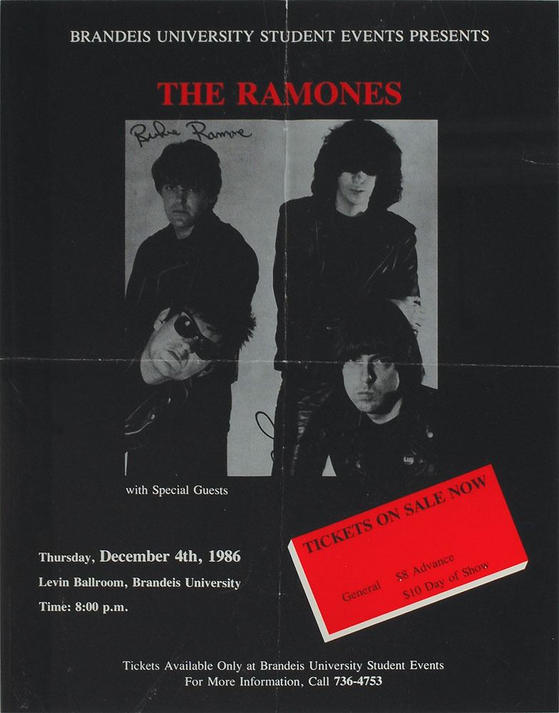 Color 16.75 x 21.75 concert poster for a Ramones show at Brandeis University’s Levin Ballroom on December 4, 1986, depicting the band in their trademark leather, signed on their image in black felt tip by Richie and Johnny Ramone. In very good condition, with heavy folds and moderate creasing. From The Monte A. Melnick Ramones Collection. Pre-certified REAL.