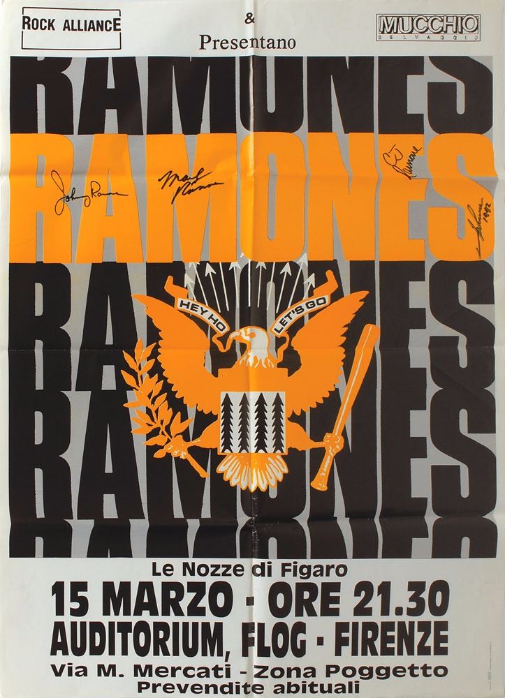 Large color 27.5 x 39 poster for a Ramones concert at Auditorium Flog in Florence, Italy on March 15, 1992, signed in black felt tip by Johnny, Marky, CJ, and Joey Ramone, who adds "1992." Poster features the Ramones eagle against stacked band logos. In fine, folded condition. From The Monte A. Melnick Ramones Collection. Pre-certified REAL.