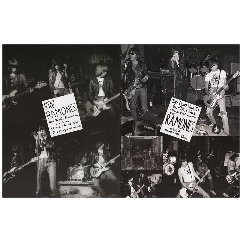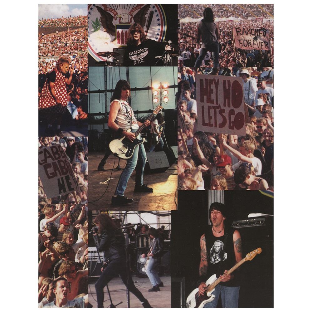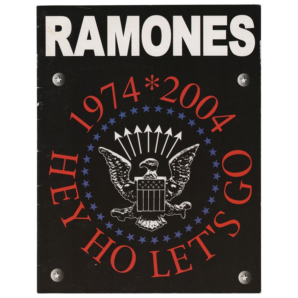 Uncommon retrospective program honoring the 30th anniversary of the Ramones, 20 pages, 8.5 x 11, which contains numerous photos of the band taken at various stages of their legendary career, with the front cover featuring the band’s name and ‘presidential seal’ logo with surrounding text: “1974–2004, Hey Ho Let’s Go.†In fine condition, with some scuffing to the back cover.